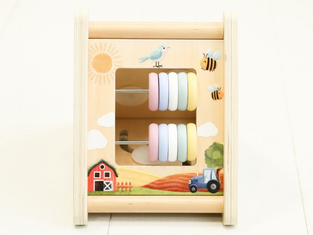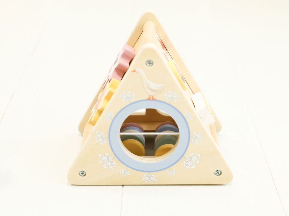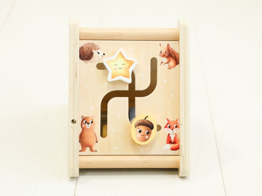 Activity board so zvieratkami v trojuholníkovom prevedení ponúka 5 zábavných aktivít: počítadlo, bludisko, ozubené kolieska, vkladačku a hru Hmataj a nájdi. Každá aktivita je navrhnutá tak, aby deti motivovala na objavovanie a prirodzené učenie.