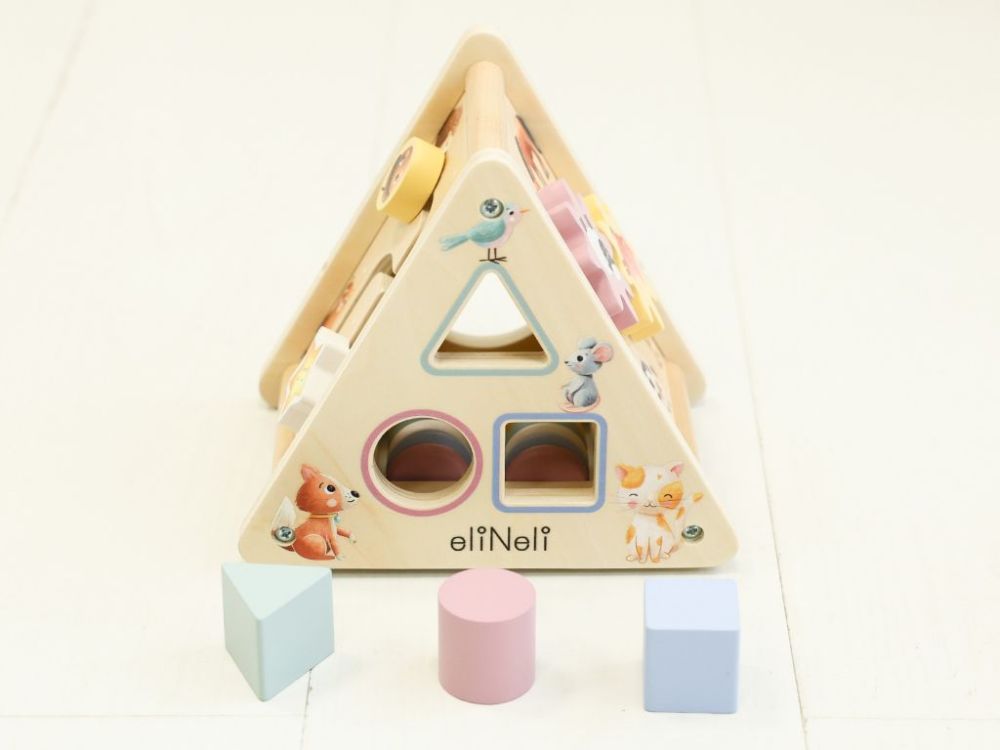 Drevený activity board trojuholník so zvieratkami, v novom vylepšenom dizajne s originálnymi ilustráciami zvieratiek, ponúka 5 zábavných aktivít v jednom. Každá strana trojuholníka s aktivitami prináša nové úlohy a hry, ktoré deti motivujú objavovať. Táto motorická hračka rozvíja jemnú motoriku, koordináciu ruky a oka, logické myslenie aj detskú fantáziu.