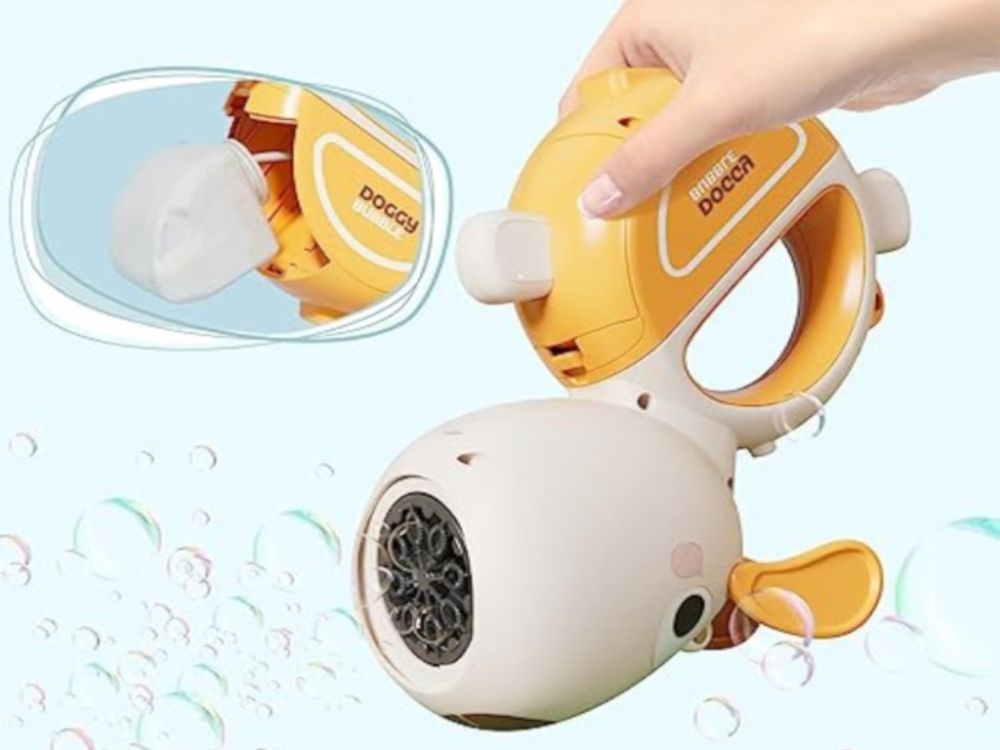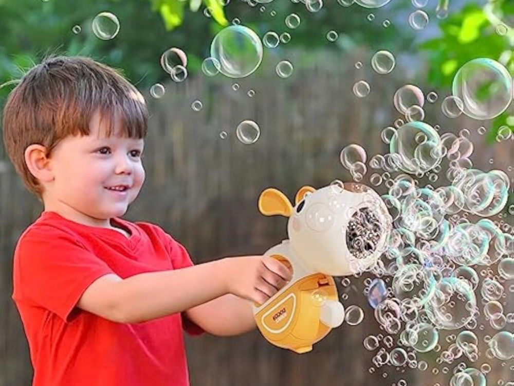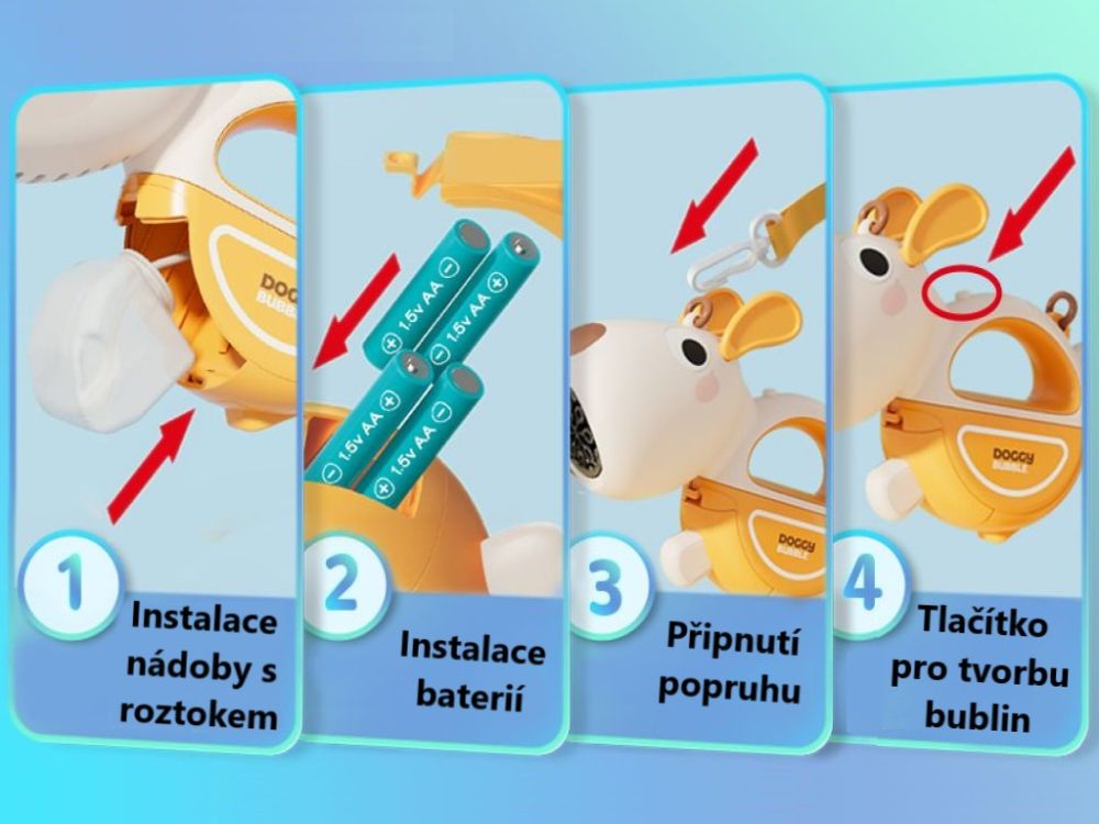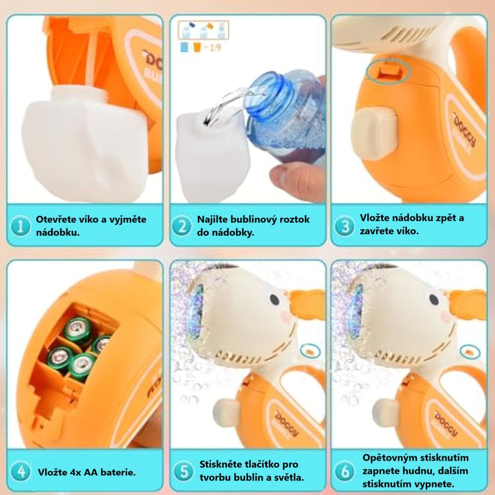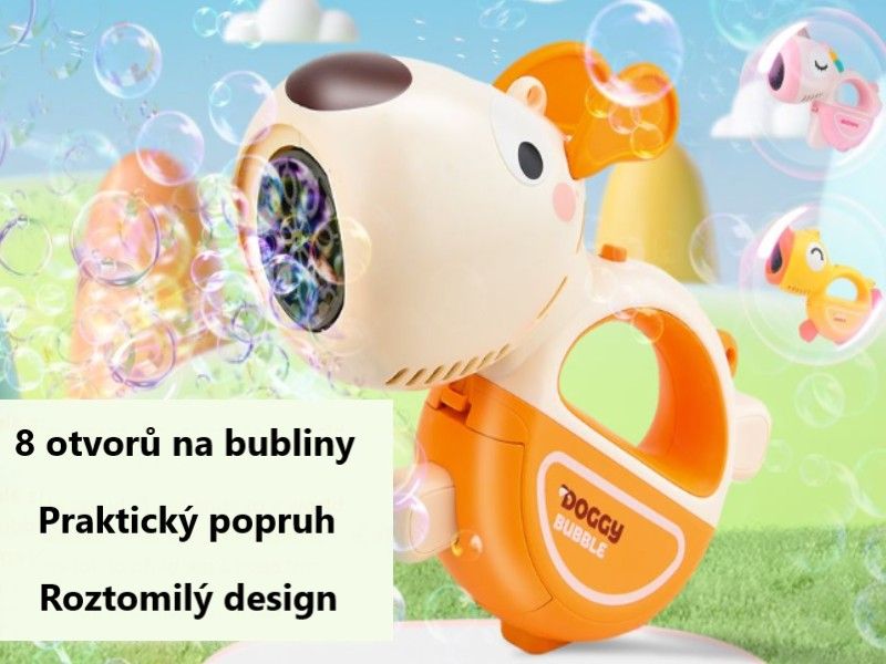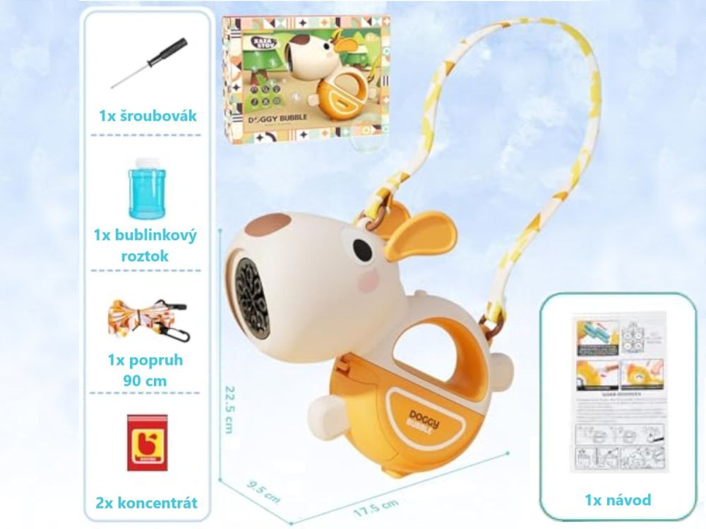 Tento roztomilý bublifuk v podobe kamarátskeho psíka premení každú chvíľku na čarovný zážitok plný bublín. Deti vôbec nemusia fúkať ústami, všetko prebieha úplne samé vďaka chytrému mechanizmu. Stačí naplniť nádobku bublinkovým roztokom, vložiť batérie a jediným stlačením tlačidla začne psík automaticky fúkať množstvo krásnych dúhových bubliniek. Počas jednej minúty ich vyprodukuje neuveriteľných 10 000. Okrem toho aj svieti a hrá veselé melódie.