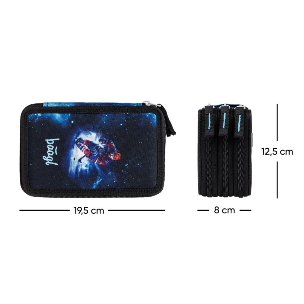 Trojposchodový peračník s hokejovým motívom pojme všetky písacie potreby a vďaka gumičkám aj hrubé pastelky alebo fixky. Vystužený chrbát školského puzdra zabezpečuje jednoduché zatváranie a udržiava poriadok vo vnútri.