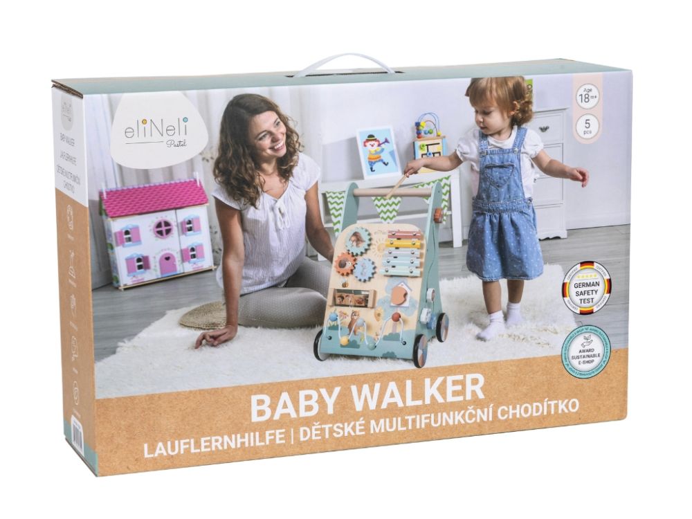 Krásne multifunkčné chodítko pre deti s xylofónom zaujme svojím spracovaním a množstvom možností na hru a vzdelávanie. Pomáha deťom samostatne chodiť a rozvíja jemnú aj hrubú motoriku. Ponúka vkladačku, dráhu s autíčkami, ozubené kolieska a mnoho ďalšieho.
