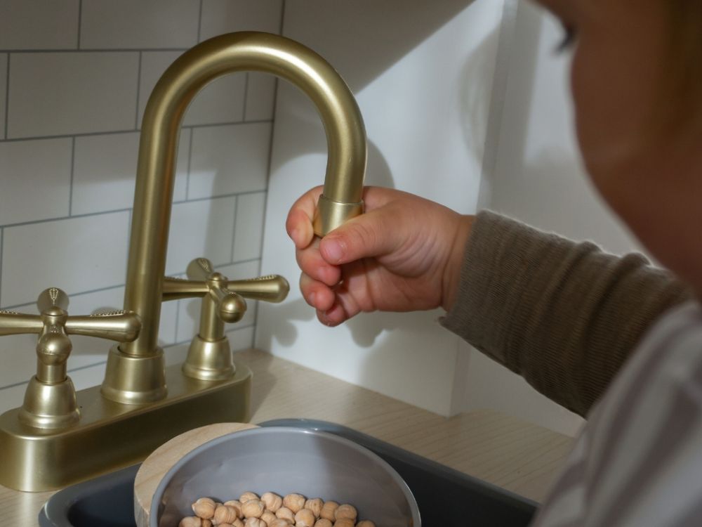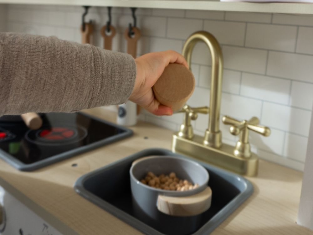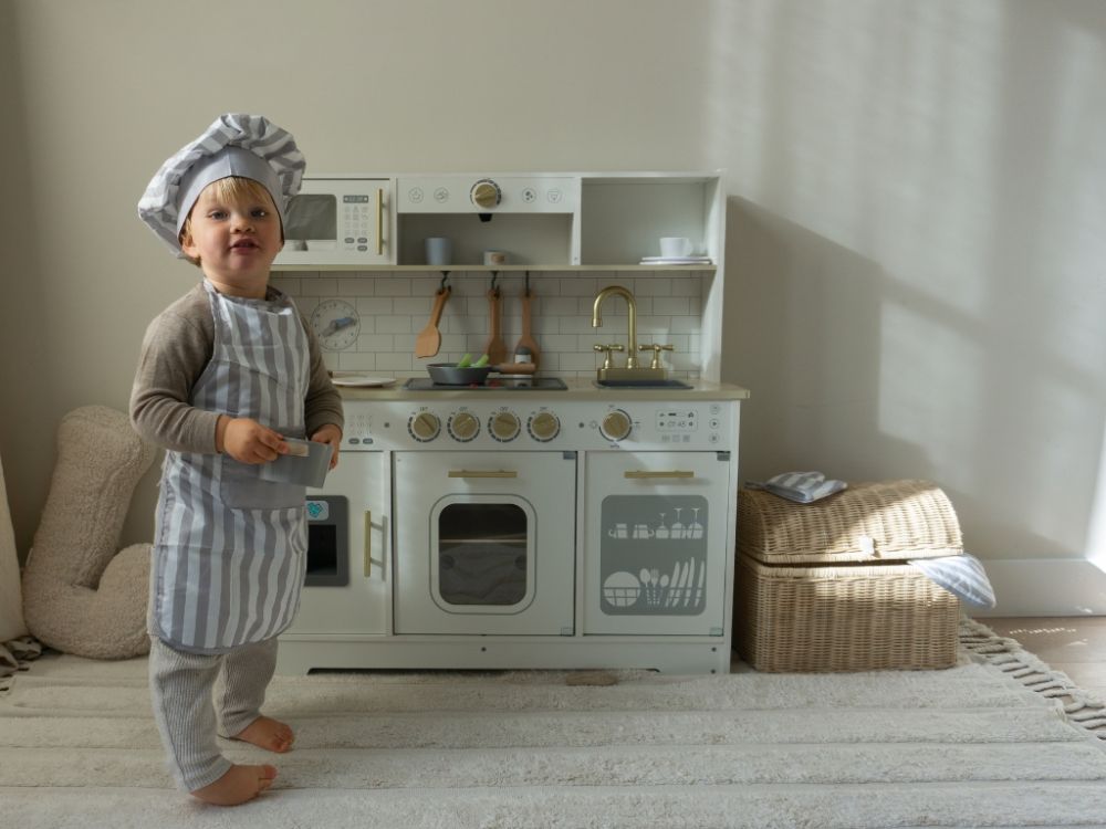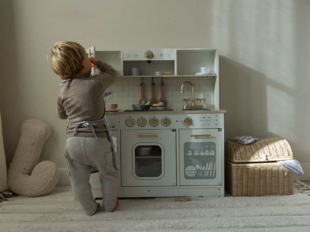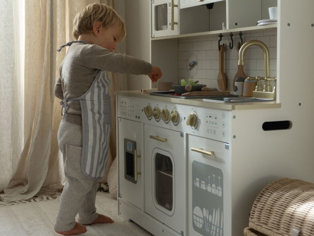 Detská kuchynka v krémovej farbe so zlatými detailmi, je svojim škandinávskym štýlom vhodná do každého interiéru. Drevená kuchynka s množstvom moderných spotrebičov nadchne každého malého kuchárika a gazdinku. V detskej kuchynke si deti vyskúšajú varenie, pečenie, umývanie riadu a prípravu pokrmov bezpečným detským spôsobom. Pri hre v detskej kuchynke deti zdokonalia svoje schopnosti a ešte si užijú množstvo zábavy.
