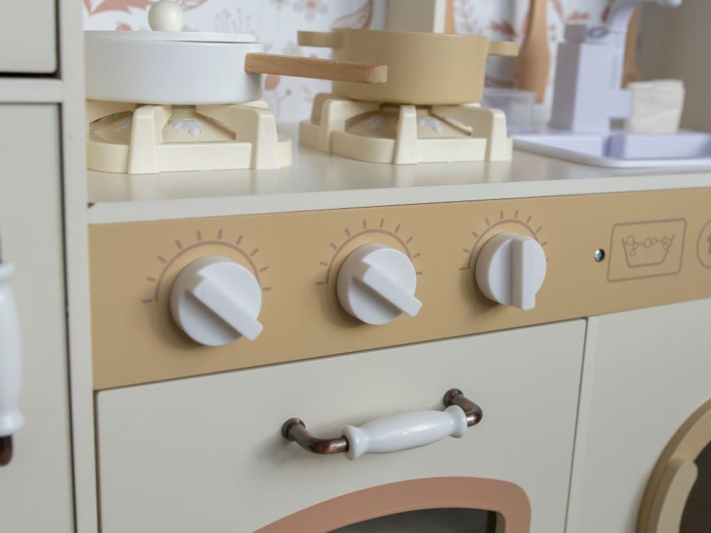 Detská kuchynka v svetlých farebných tónoch, zdobená kvetmi, je štýlovou edukatívnou hračkou pre deti od 3 rokov. V drevenej kuchynke s modernými spotrebičmi a tečúcou vodou popustia deti uzdu svojej fantázii, môžu variť, piecť a ohrievať jedlo, variť kávu a pokojne vyprať špinavú bielizeň. Jednoducho si vyskúšajú dospelácke činnosti bezpečným detským spôsobom. Reálny nádych celej hre dodajú zvukové efekty, ktoré vydáva sporák alebo vodovodná batéria.