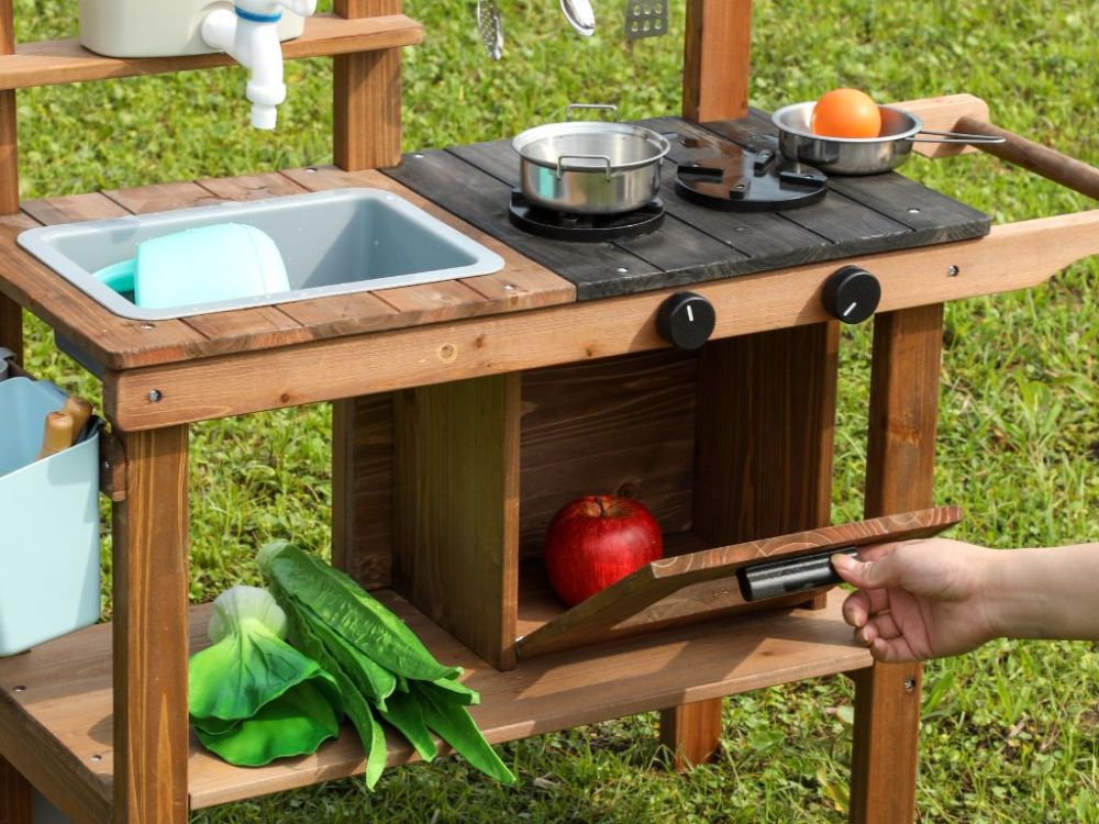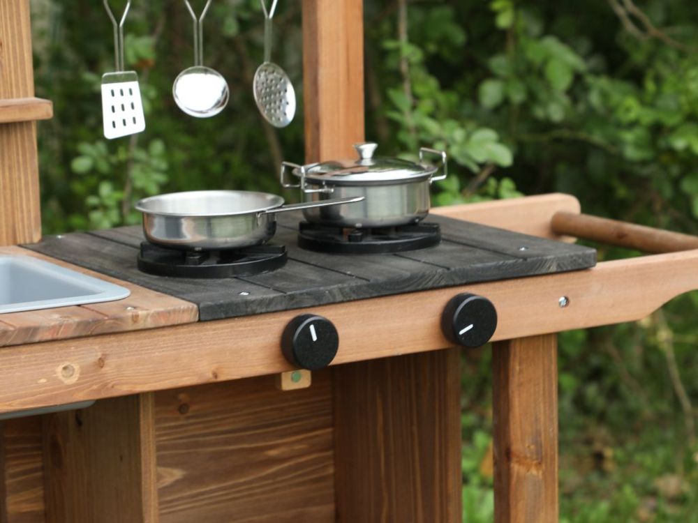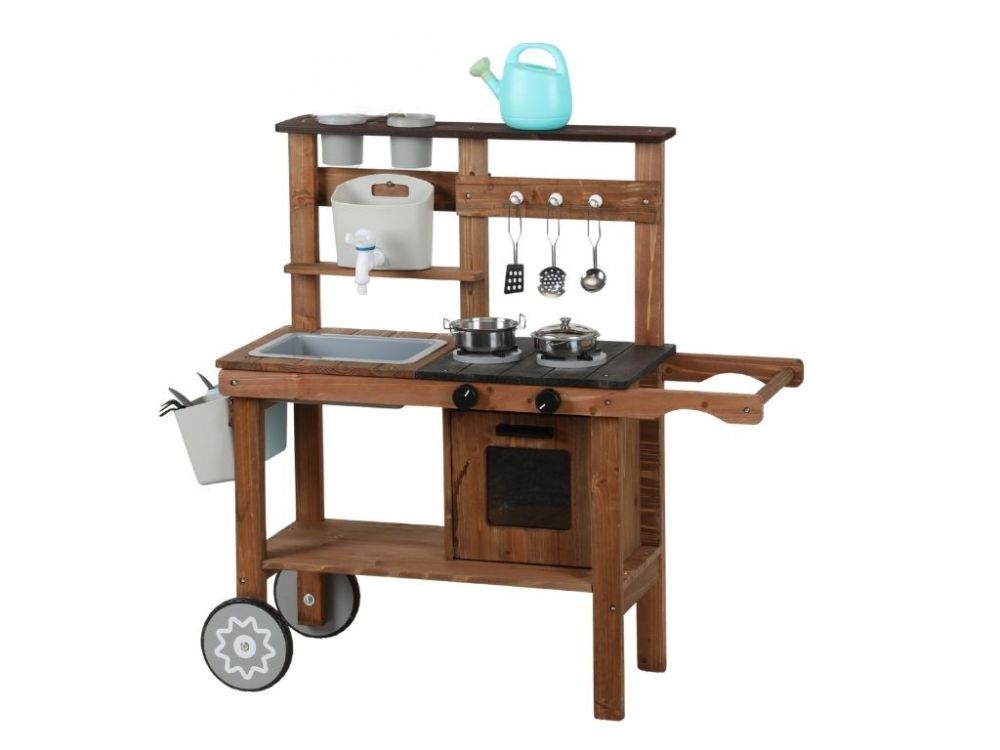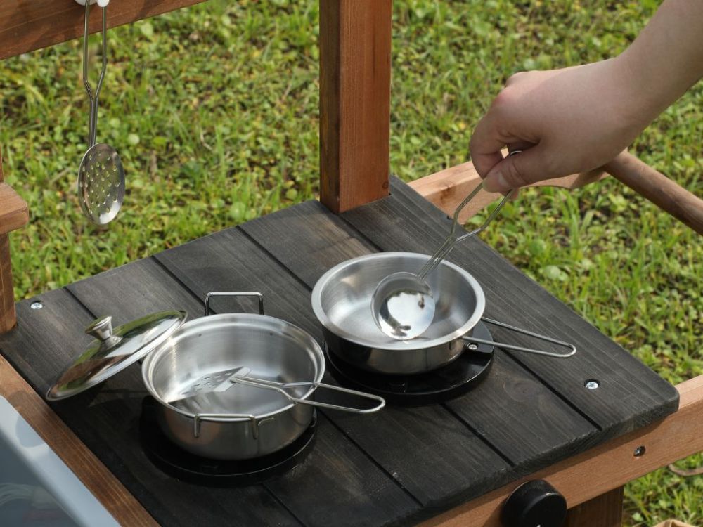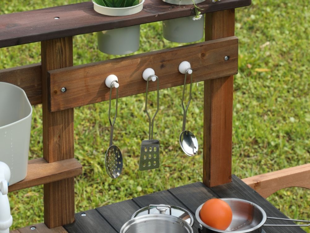 Vonkajšia detská kuchynka z masívneho dreva ponúka autentickú hru na varenie a podporuje nápadité hranie rolí. Obsahuje hrnce, panvice a kvetináče, ktoré podporujú rozvoj kreativity a jemnej motoriky. Neutrálne farebné prevedenie je vhodné pre dievčatá aj chlapcov.
