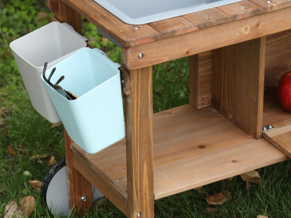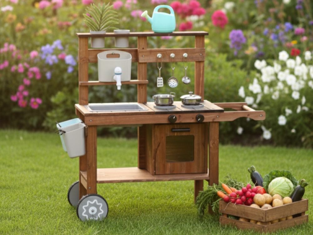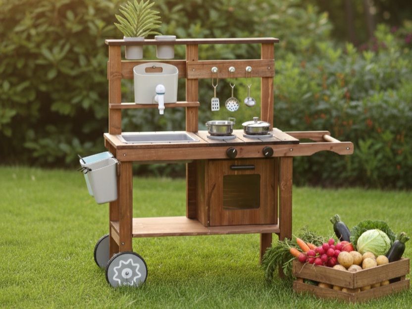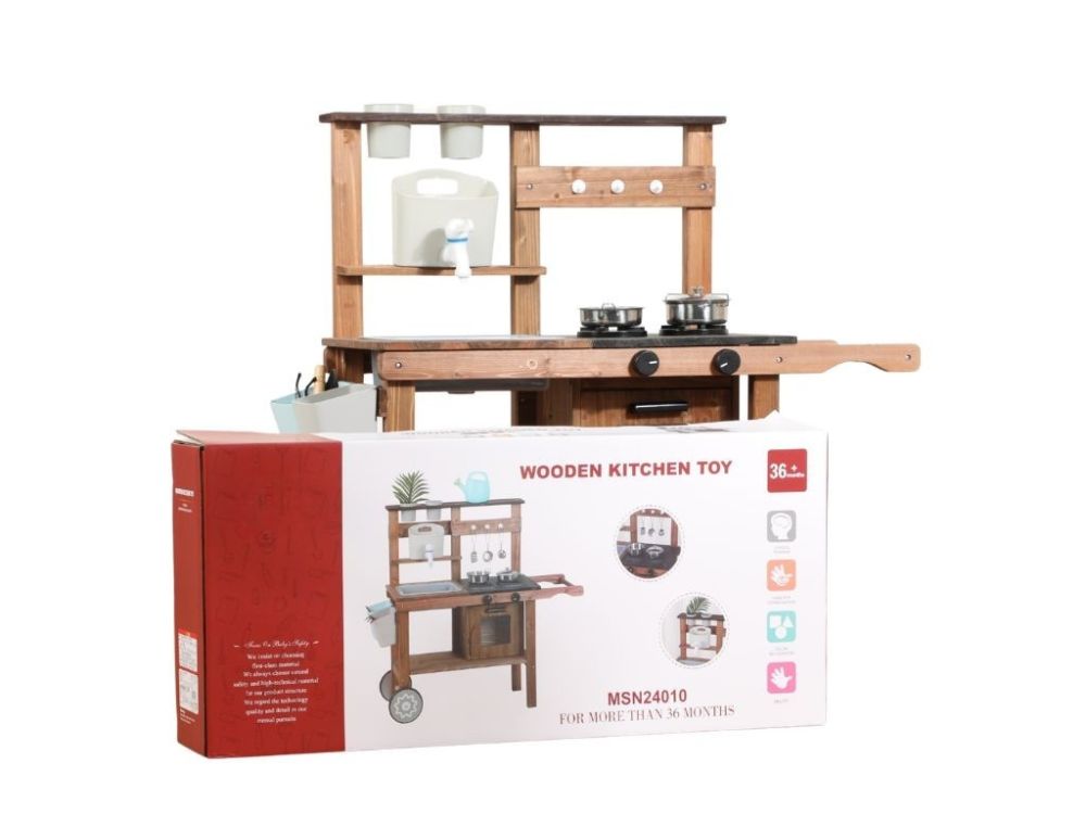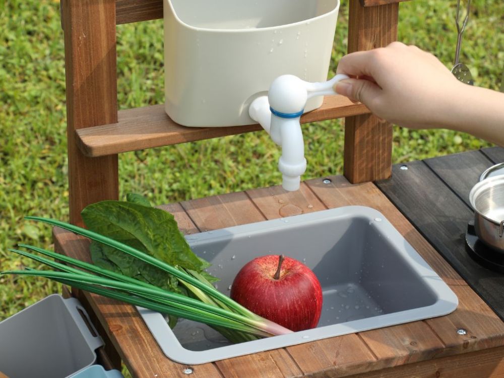 Vonkajšia detská kuchynka z masívneho dreva ponúka autentickú hru na varenie a podporuje nápadité hranie rolí. Obsahuje hrnce, panvice a kvetináče, ktoré podporujú rozvoj kreativity a jemnej motoriky. Neutrálne farebné prevedenie je vhodné pre dievčatá aj chlapcov.