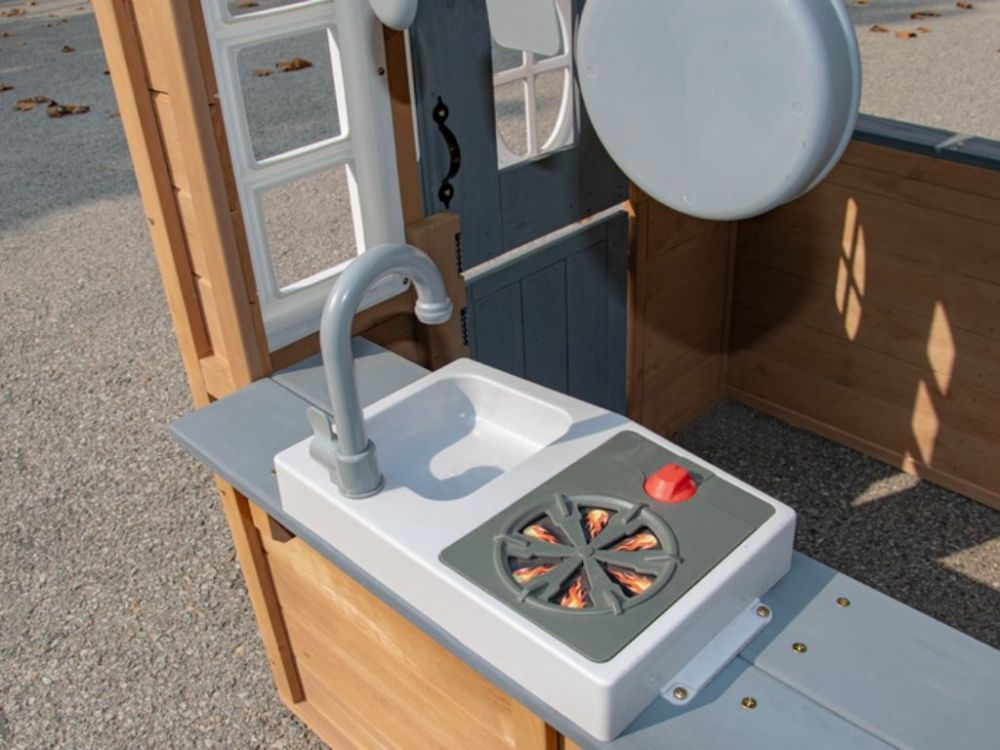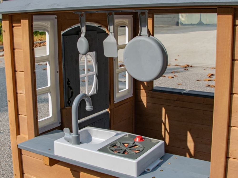 Domček podporuje interaktívnu a nápaditú hru prostredníctvom premyslených detailov. Deti môžu pomocou integrovanej hracej kuchynky s náčiním simulovať varenie alebo každodenné činnosti.