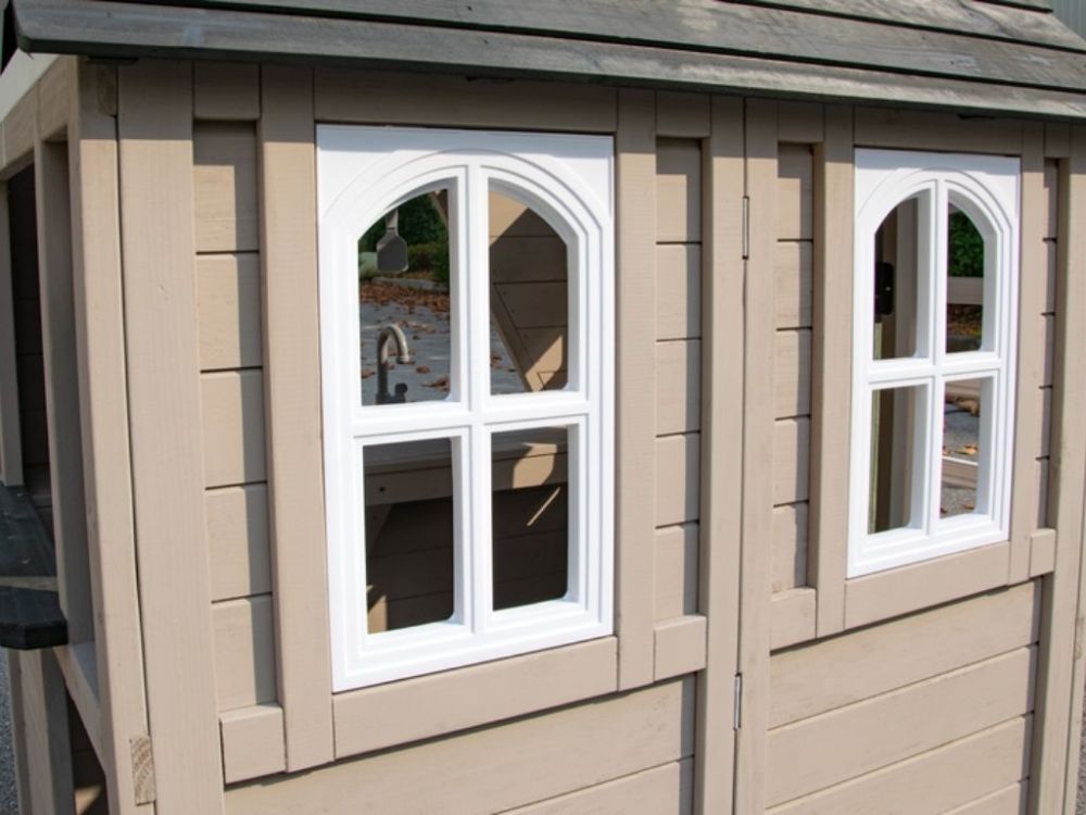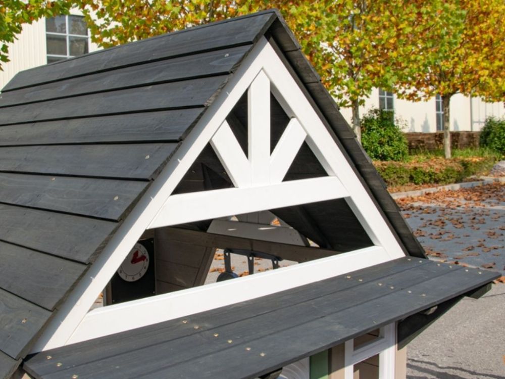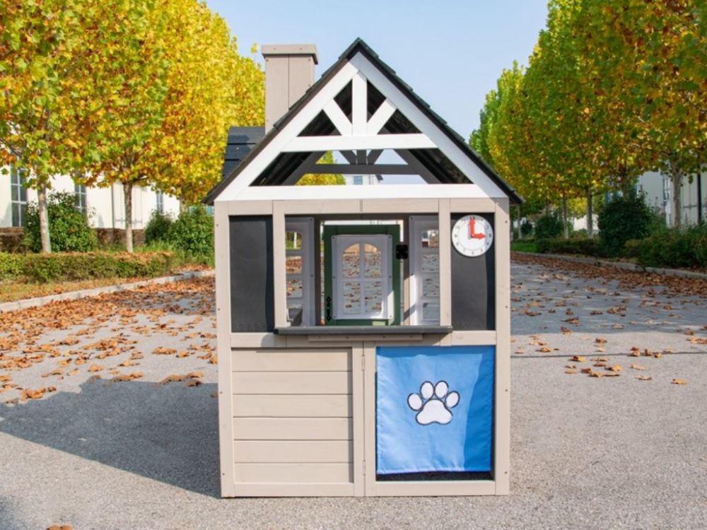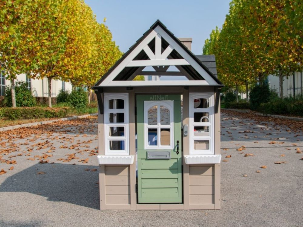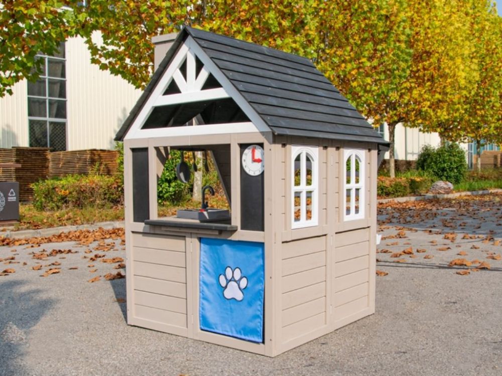 Domček na hranie je vybavený predným presahom strechy a otvorom na poštu na dverách, ktoré dodávajú autenticitu a podporujú detskú predstavivosť.
