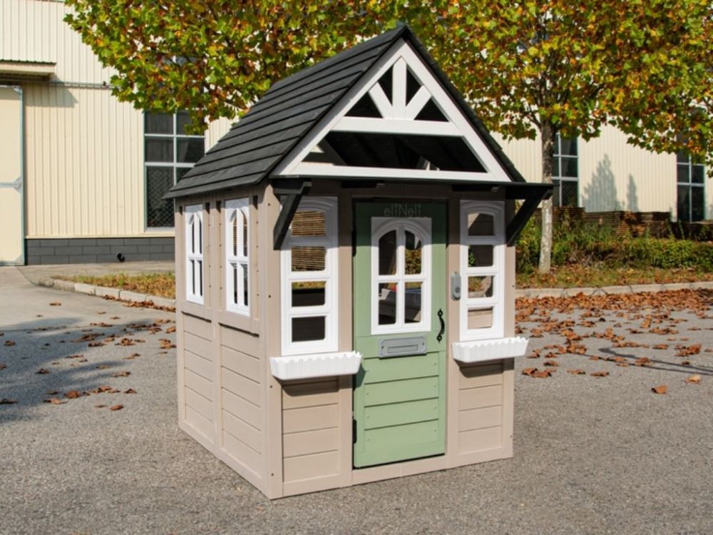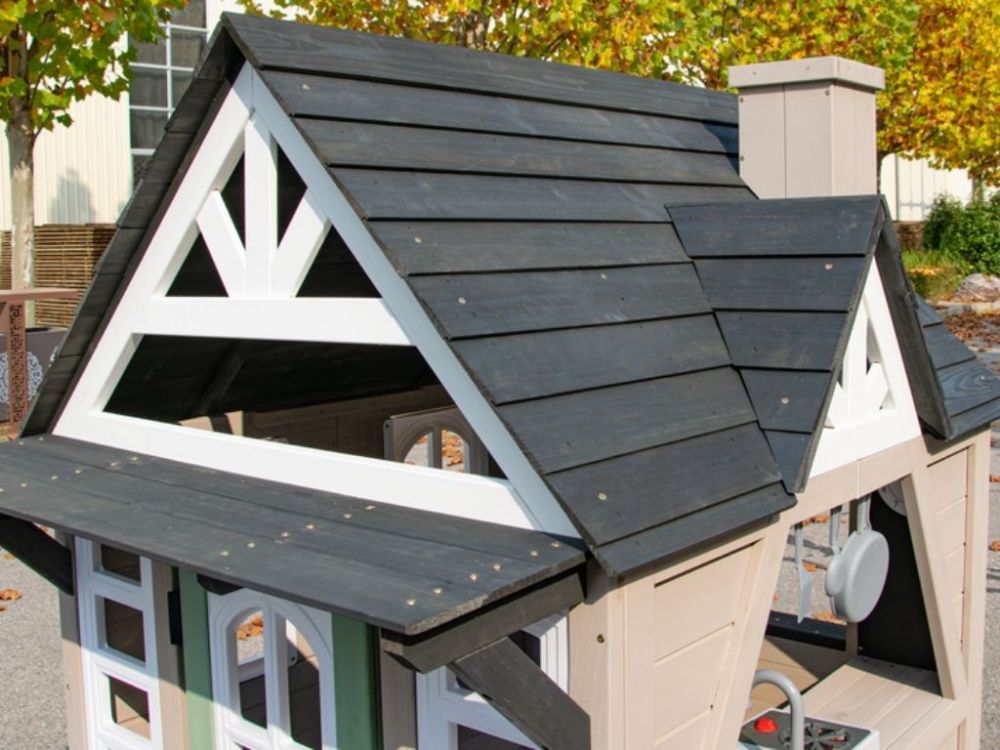 Klasický vonkajší domček na hranie s trojuholníkovým oknom, detailom komína a vnútornou kuchynkou na hranie ponúka realistické detaily a podnecuje deti k nápaditému hraniu rolí.
