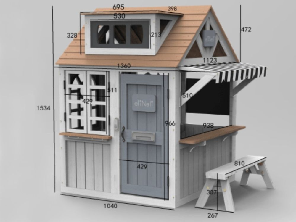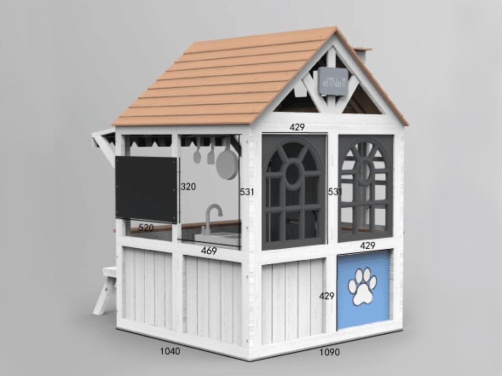 Vonkajší domček na hranie ponúka priestor na kreatívnu hru s predajným okienkom, pohyblivou lavičkou, kuchynkou s riadom a tabuľou. Holandské dvere, magnetické okná, poštová schránka na dverách a vchod pre domáce zvieratká podporujú interaktívne hranie.
