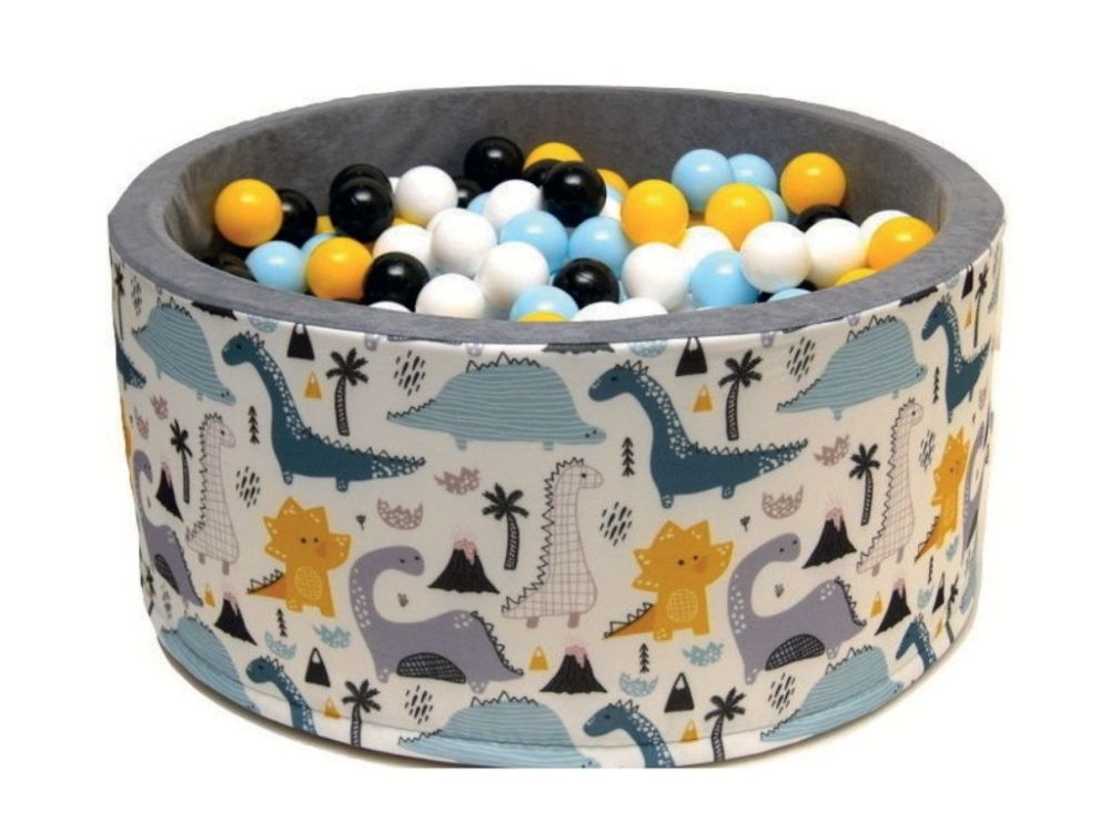 Detský suchý bazén s motívom dinosaurov a 200 farebnými loptičkami podporuje pohyb, koordináciu a zmyslové vnímanie. Je vyrobený z mäkkého, netoxického materiálu, ľahko sa čistí a je vhodný pre deti od 6 mesiacov.