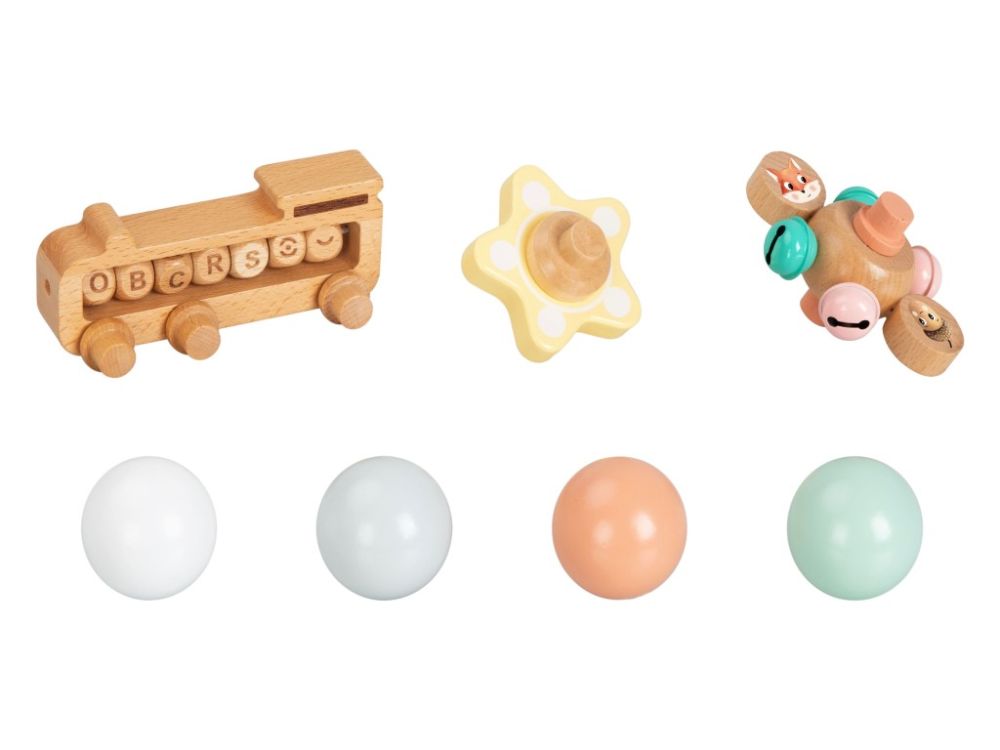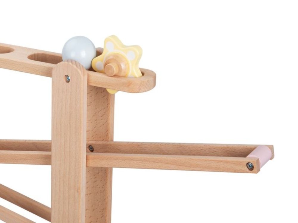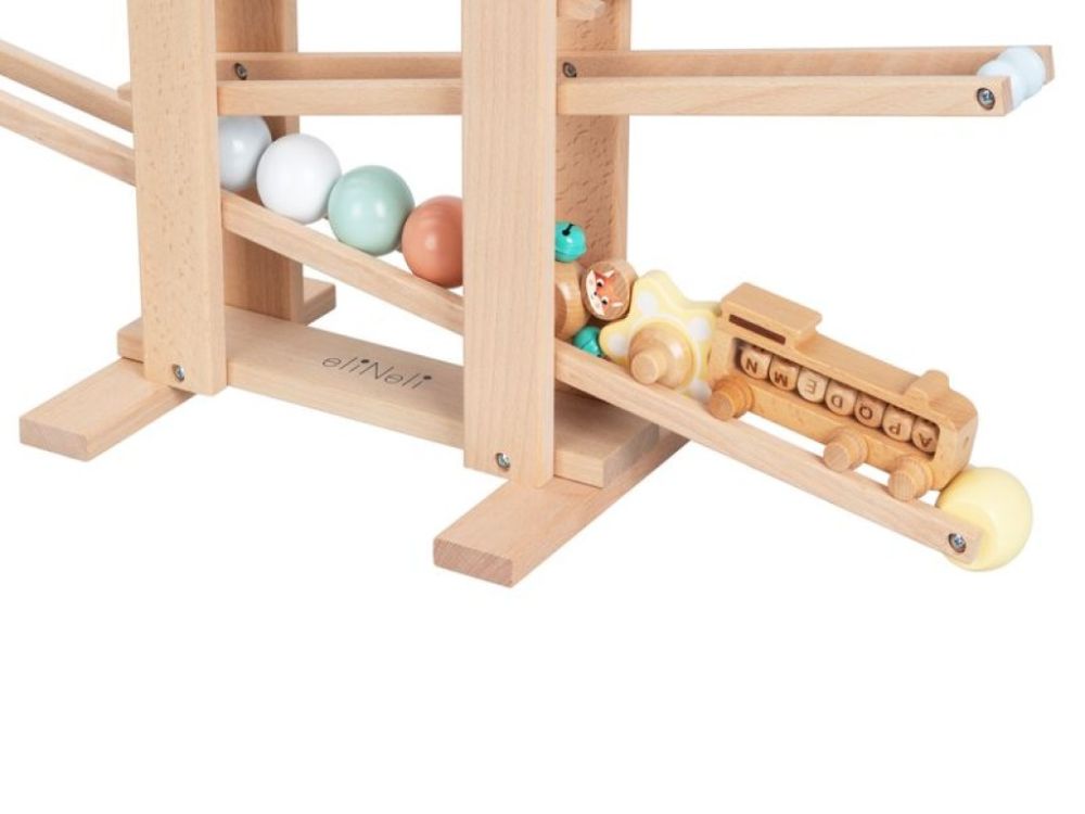 Drevená guľôčková dráha XL z kvalitného prírodného dreva ponúka zábavné pohyblivé prvky, guľôčky a vláčik. Pri sledovaní padajúcich guľôčok a doplnkov si deti prirodzene rozvíjajú jemnú motoriku, koordináciu aj sústredenie. Skvelá motorická hračka pre deti aj celú rodinu.