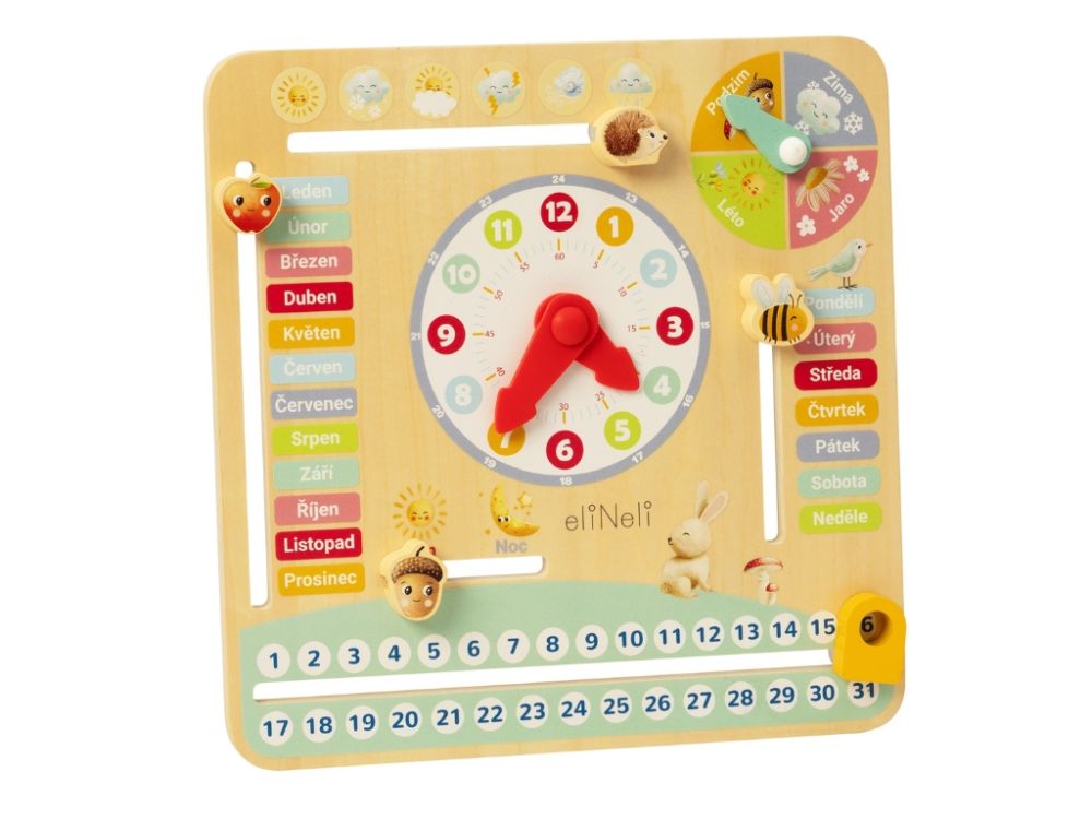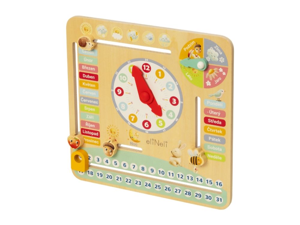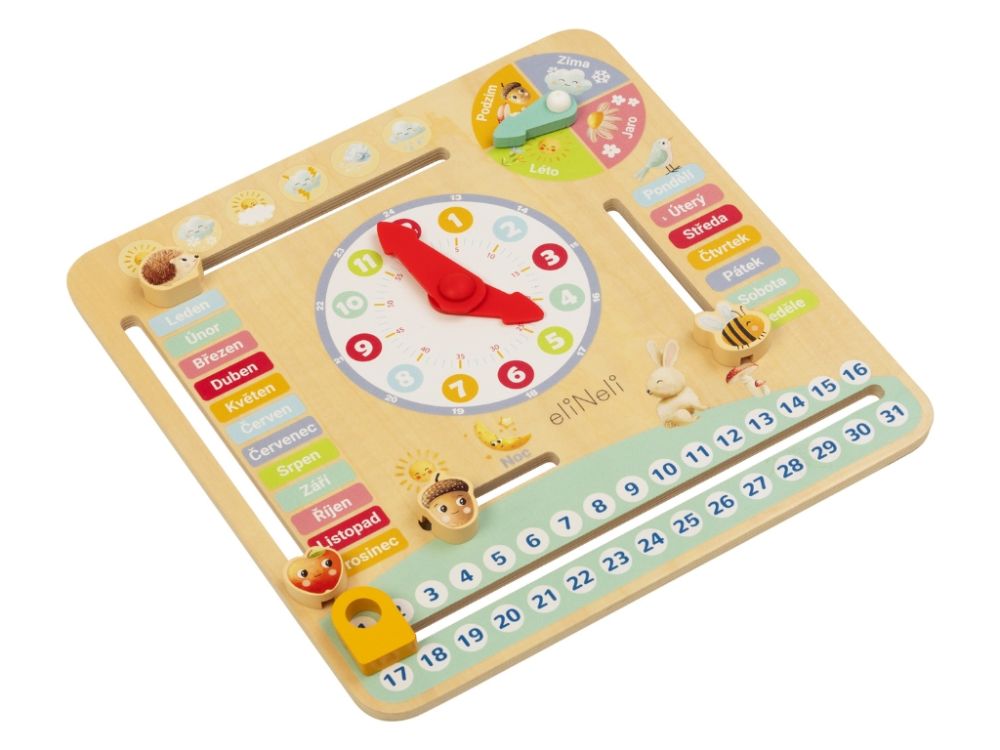 Drevený kalendár s hodinami je ideálnou vzdelávacou hračkou a dekoráciou do detskej izby. Pomocou zábavných prvkov učí deti rozpoznávať čas, dni, mesiace a ročné obdobia. Podporuje kognitívny rozvoj detí a ich jemnú motoriku.