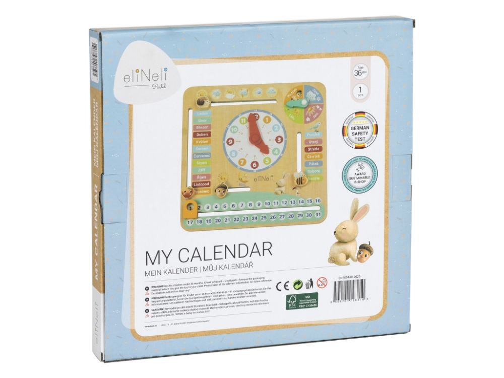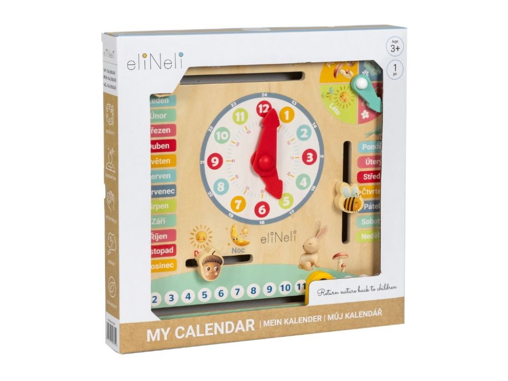 Kalendár zábavnou formou oboznamuje deti s dňami v týždni, mesiacmi a ročnými obdobiami. Veselé zvieratká a prírodné motívy pomáhajú deťom rozpoznávať jednotlivé časti roka, rozvíjať vedomosti a učiť sa orientovať v čase pomocou veľkých hodín a červených ručičiek.