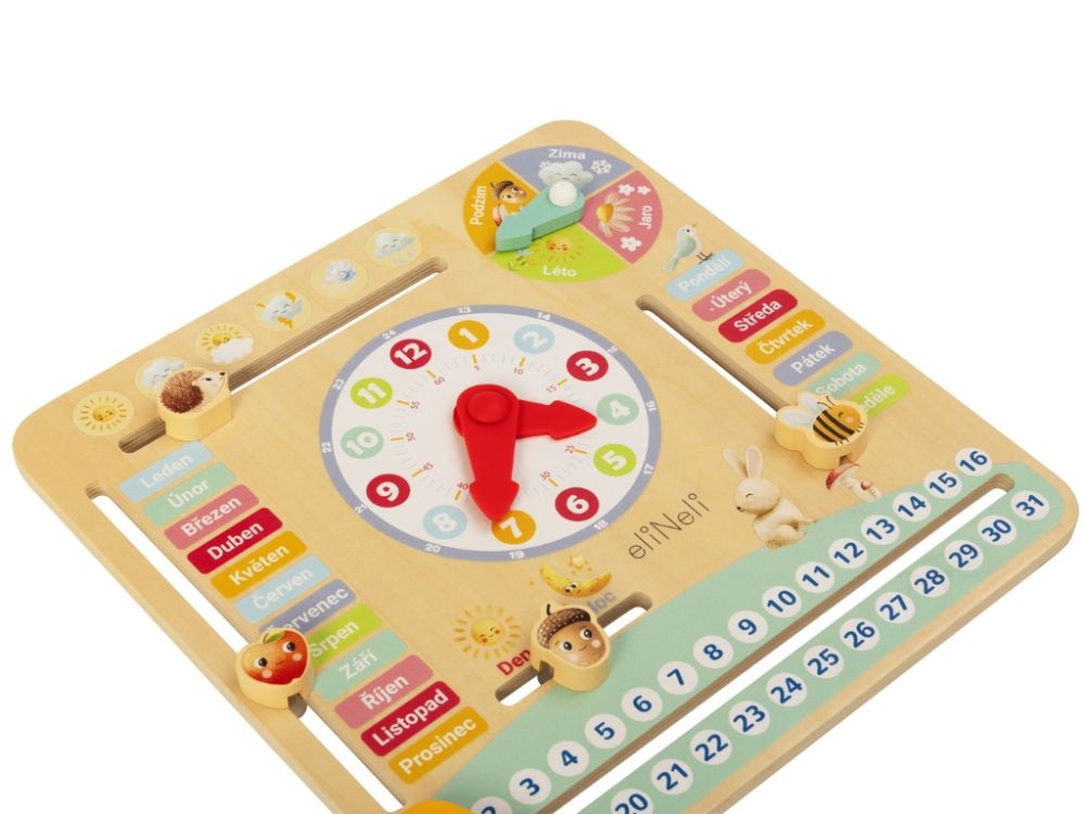 Pohyblivé prvky, ako napríklad včielka označujúca aktuálny deň, ježko sledujúci počasie alebo žaluď ukazujúci deň a noc, aktívne zapájajú deti do učenia. Kalendár podporuje jemnú motoriku a kognitívne zručnosti, takže zábava a učenie prebiehajú súčasne.