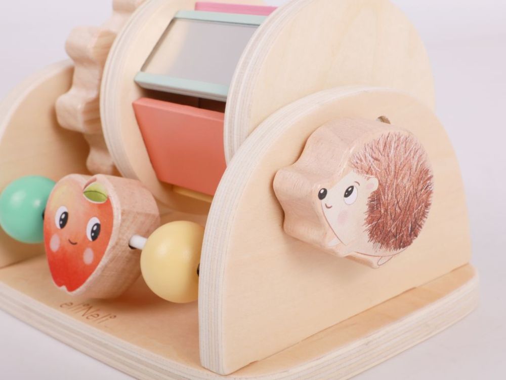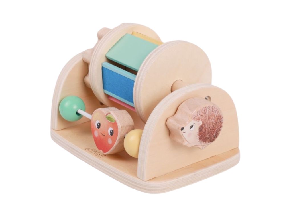 Drevený senzorický bubienok v dizajne s originálnymi ilustráciami zvieratiek a ovocia je motorická hračka pre deti od 12 mesiacov, ktorá rozvíja jemnú motoriku, koordináciu aj logické myslenie. Je vyrobený z prírodných materiálov, bezpečný, estetický a vďaka interaktívnym prvkom podporuje samostatné učenie podľa Montessori princípov.