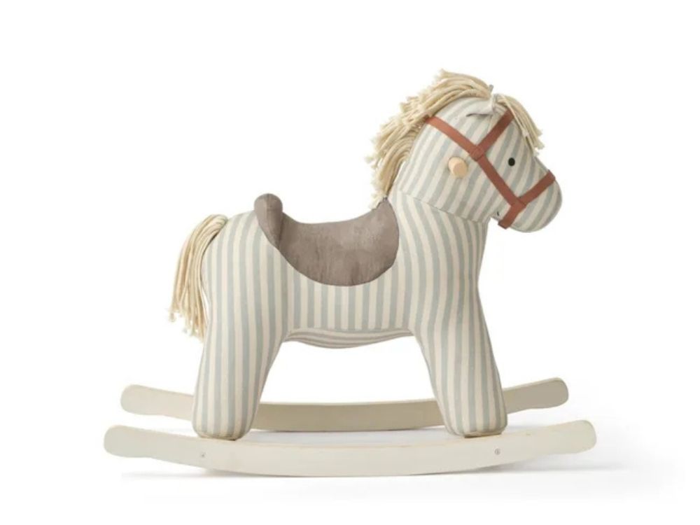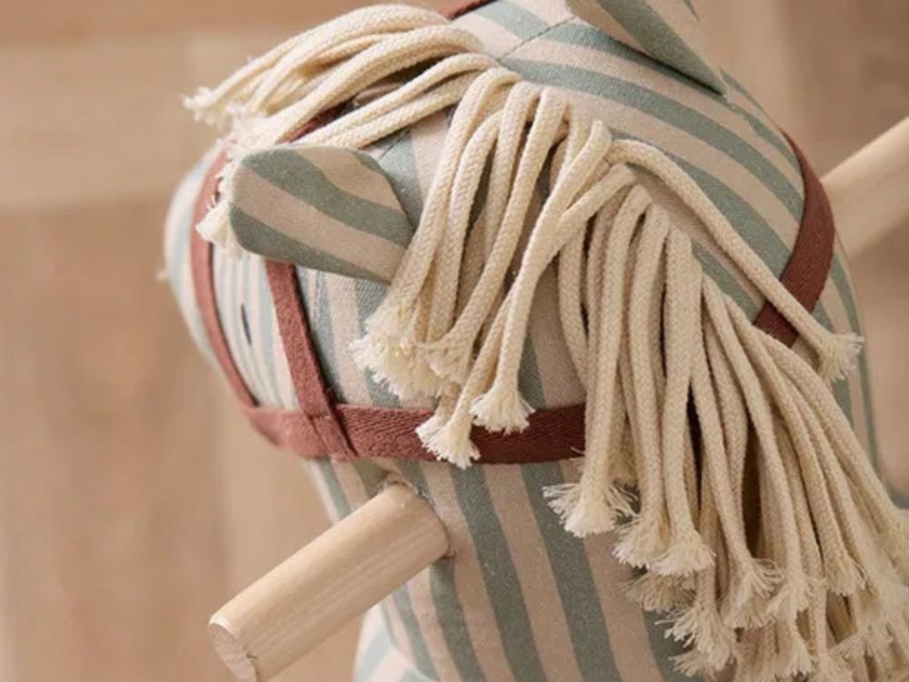 Hojdací kôň zaujme svojím očarujúcim pruhovaným dizajnom v modrej a bielej farbe. Je vyrobený z vysokokvalitných materiálov, ako je bavlna a prírodné drevo, čo zaručuje dlhú životnosť a odolnosť.