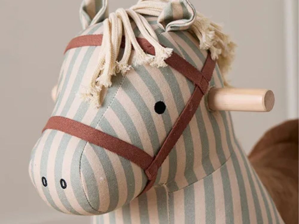 | Materiál | Sedlo: polyester, bavlna, výplň: recyklovaný polyester, hriva a chvost: bavlna, konštrukcia a rukoväť: topoľ s certifikátom FSC, preglejka |