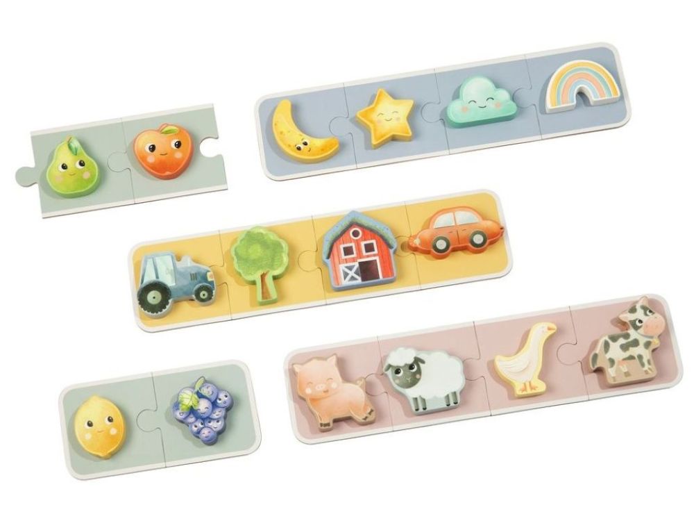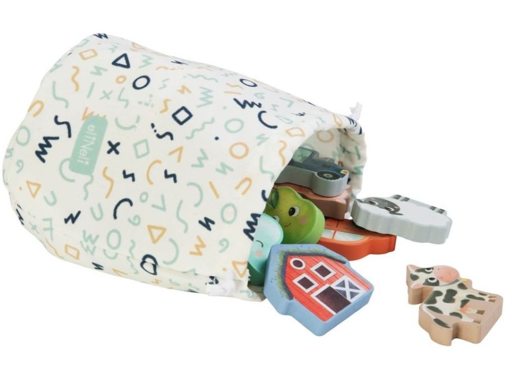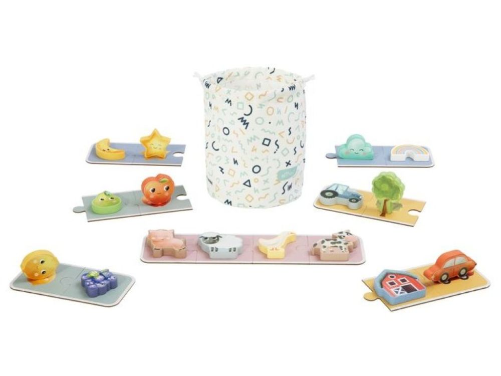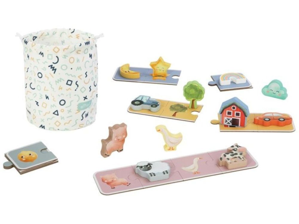 | Obsah balenia | bavlnené sťahovacie vrecúško, 16 drevených predmetov s motívom z farmy, 16 hracích kartičiek v podobe puzzle |