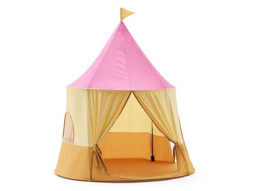 Cirkusový stan na hranie v žltej a ružovej farbe je ideálnym úkrytom pre deti, ktorý podporuje ich predstavivosť. Hrací domček sa dá ľahko postaviť napríklad na koberci v detskej izbe a vďaka prenosnej taške sa ľahko prenáša.