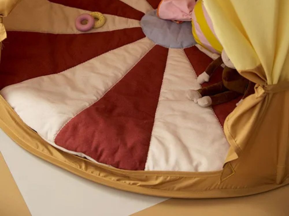 Podložka na hranie Cirkus je navrhnutá tak, aby sa ľahko zmestila do hracieho stanu Cirkus, ale je ideálna aj na samostatné použitie. Môžete ju umiestniť na podlahu v spálni a vytvoriť tak mäkké miesto na hranie alebo ju umiestniť do obývačky ako základňu pre detskú telocvičňu.