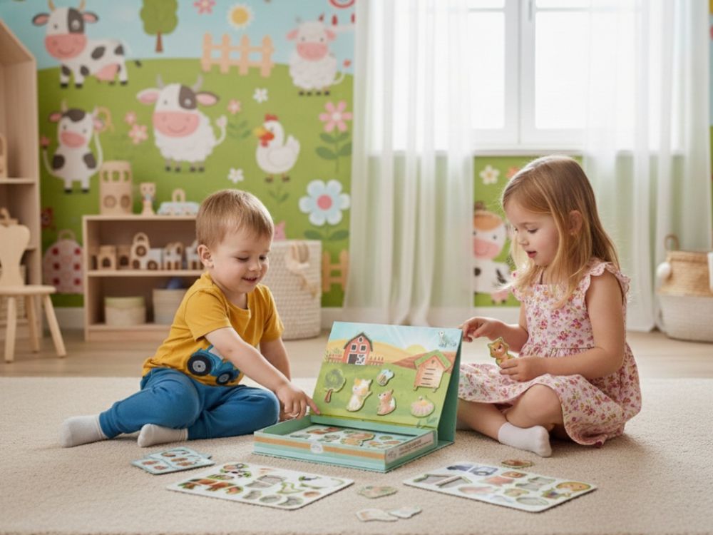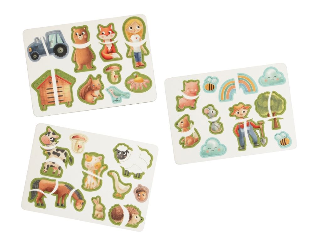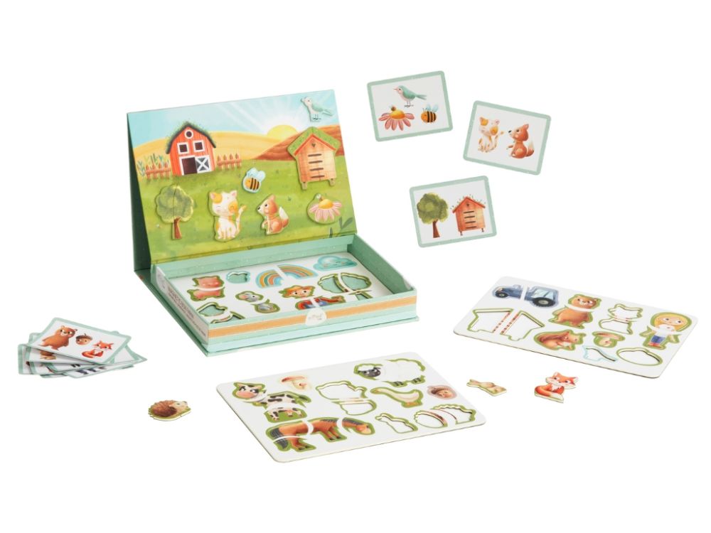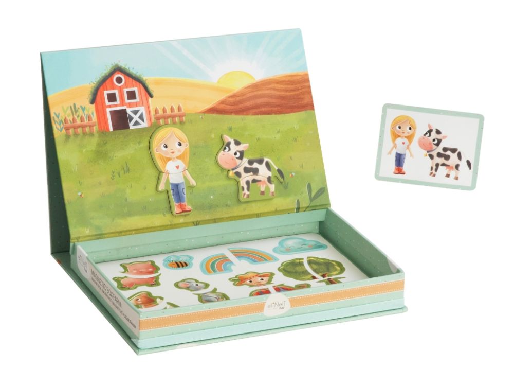 Magnetická hra 2v1 zavedie deti na farmu so zvieratkami, ktoré môžu stretnúť vo svojom okolí, v ich reálnej (skutočnej) podobe. Na magnetickom obrázku s vidieckou krajinou si deti vytvoria vlastnú farmu alebo sa len pohrajú s jednoduchým puzzle. Z jednotlivých dielikov puzzle deti poskladajú traktor, zvieratká alebo podľa priložených kartičiek celé obrázky.