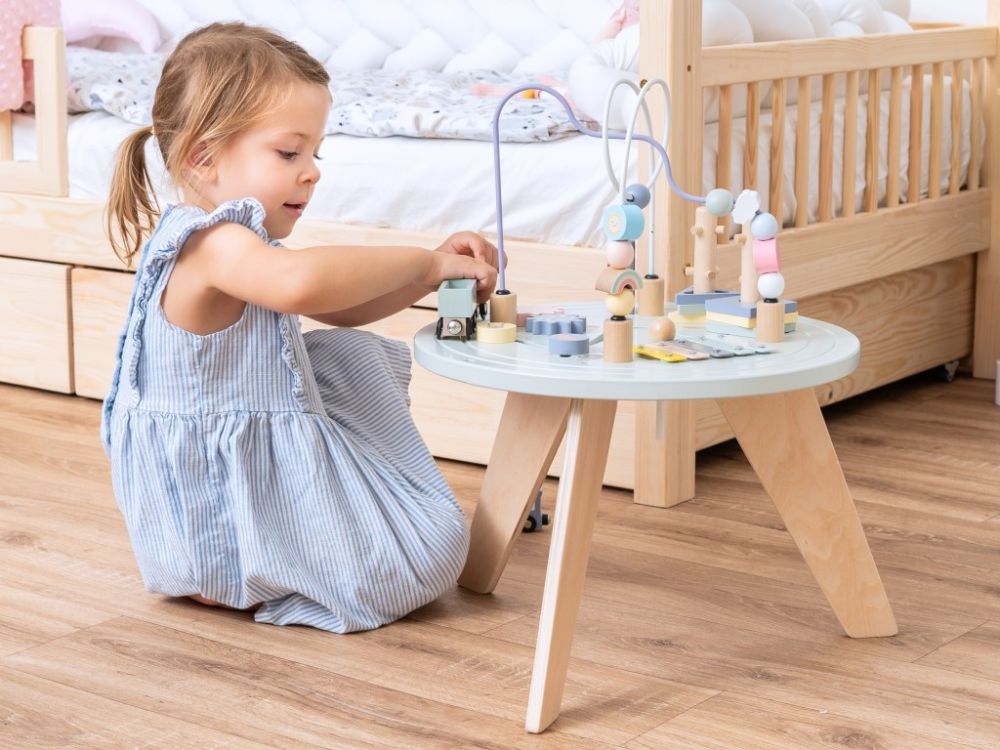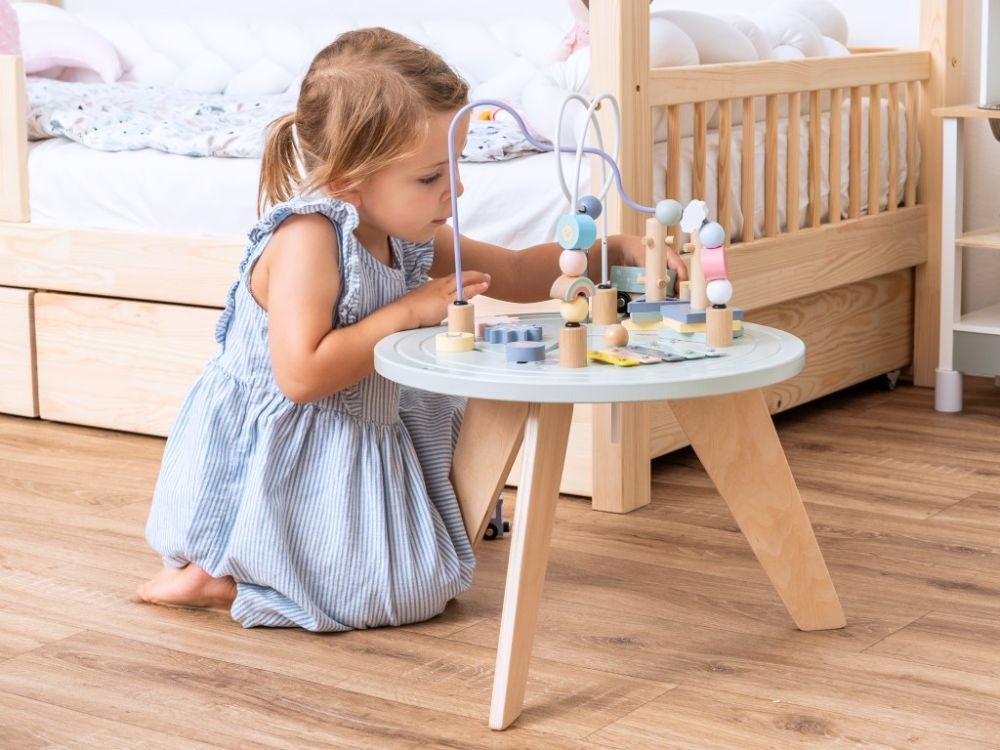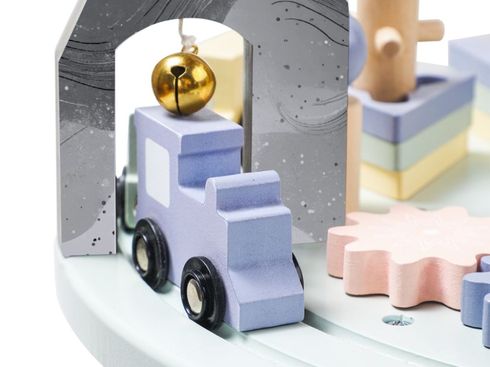 Motorický stolček v jemných pastelových farbách obsahuje hracie prvky, ktoré sú zábavné, potrénujú detské prstíky aj myseľ a stimulujú zmysly. Na motorickom activity stolčeku zaujme deti vláčikodráha s vláčikom, nasadzovacie prvky alebo napríklad xylofón.
