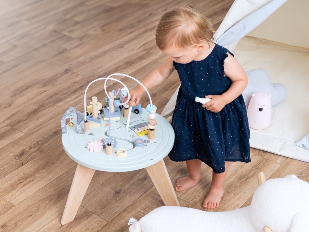 Motorický stolček ponúka deťom širokú škálu aktivít. Na stolčeku nájdu vláčikodráhu s vláčikom, závoru a tunel s rolničkou, korálkové bludisko, nasadzovaciu hru s tvarmi, ozubené kolieska, bludisko s lesnými zvieratkami a xylofón.