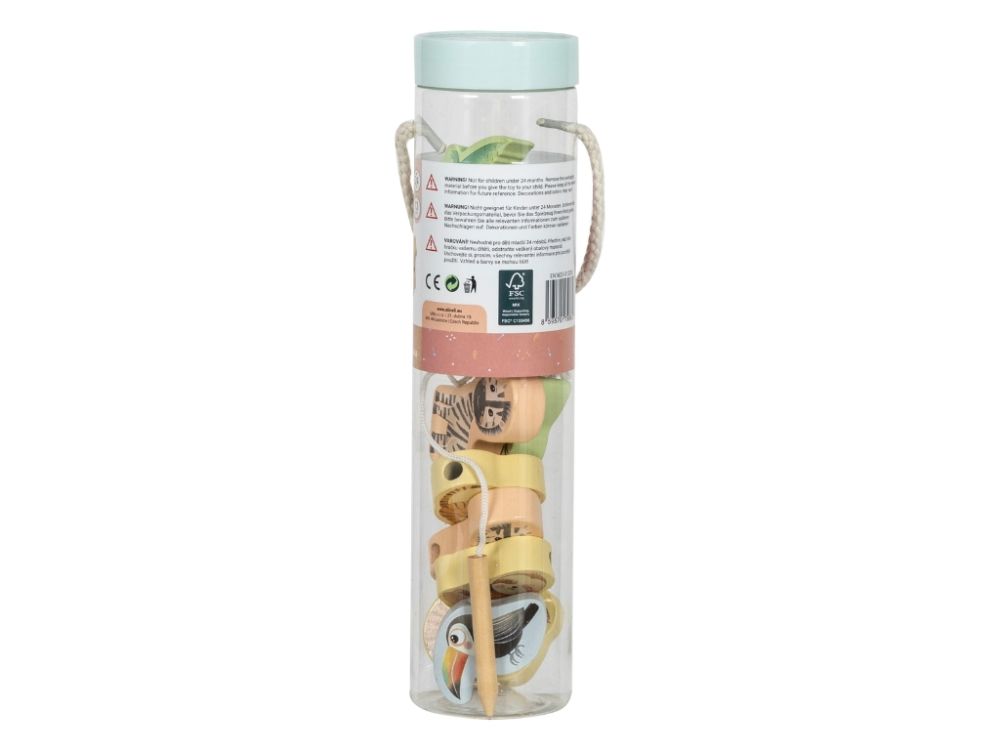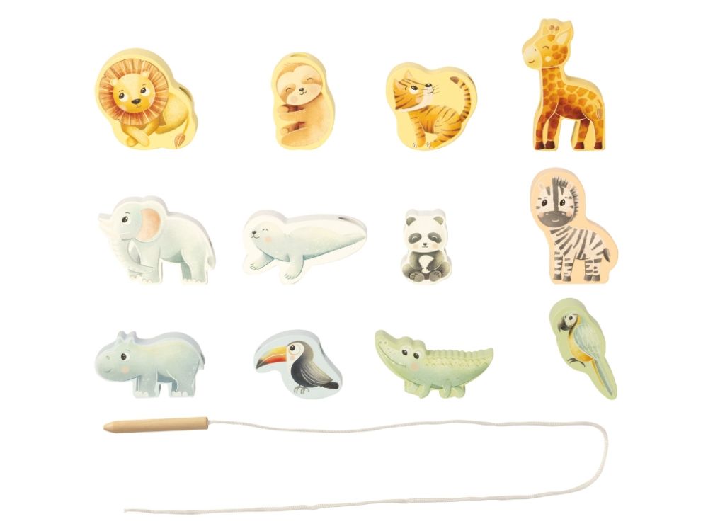 Balenie obsahuje 12 drevených zvieratiek, ktoré si deti môžu navliekať na šnúrku.