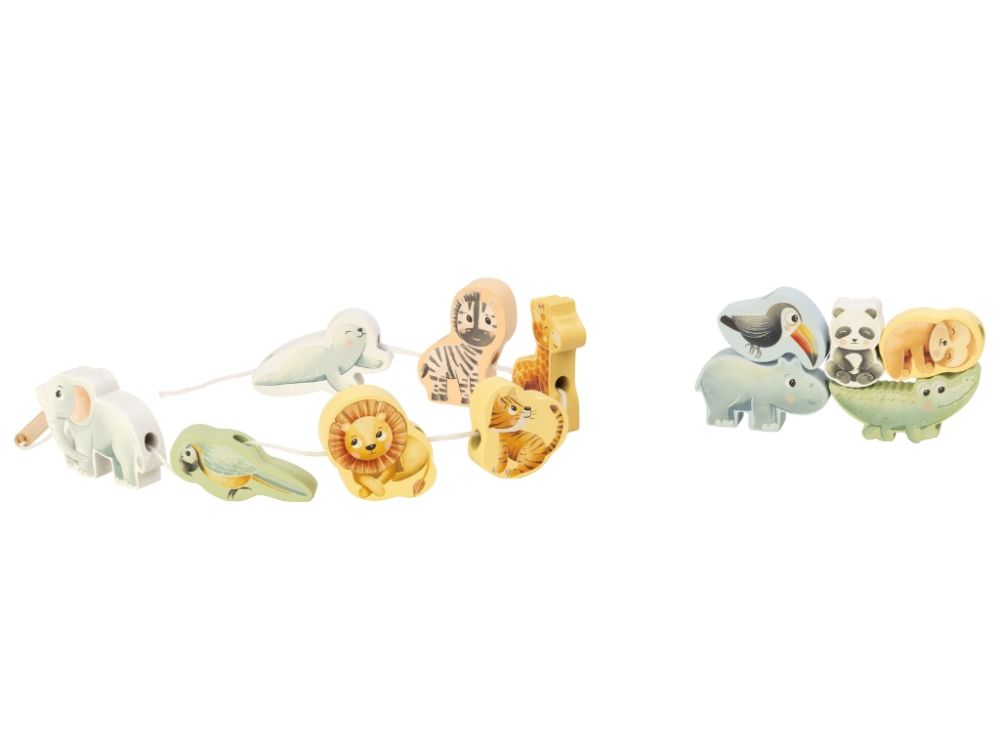 Navliekanie drevených korálok v tvare zvieratiek zo zoo zabaví detské ruky a prirodzene precvičuje koncentráciu a koordináciu oko-ruka. Rôzne tvary motivujú deti premýšľať, vyberať poradie a trénovať presnosť pohybov.