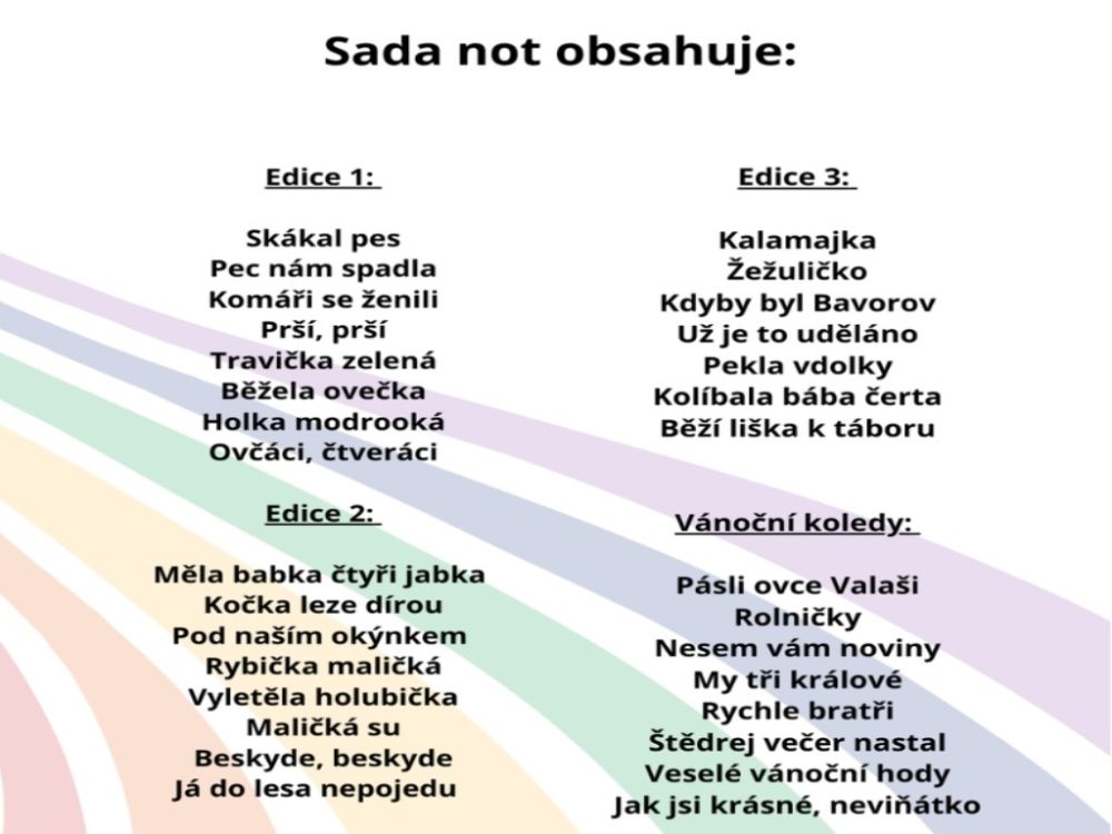 Súprava obsahuje 31 známych ľudových piesní a vianočných kolied v 4 vydaniach, ktoré premenia každý domov na miesto plné melódií. Naučte sa obľúbené piesne ako Skákal pes, Zelená tráva, Komáre sa ženili, Pod naším oknom, Nejdem do lesa, Kalamajka, Nesiem vám noviny alebo Prišiel Štedrý večer a usporiadajte si doma vlastný rodinný koncert.