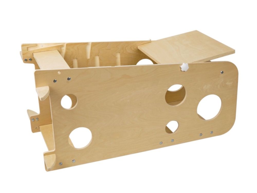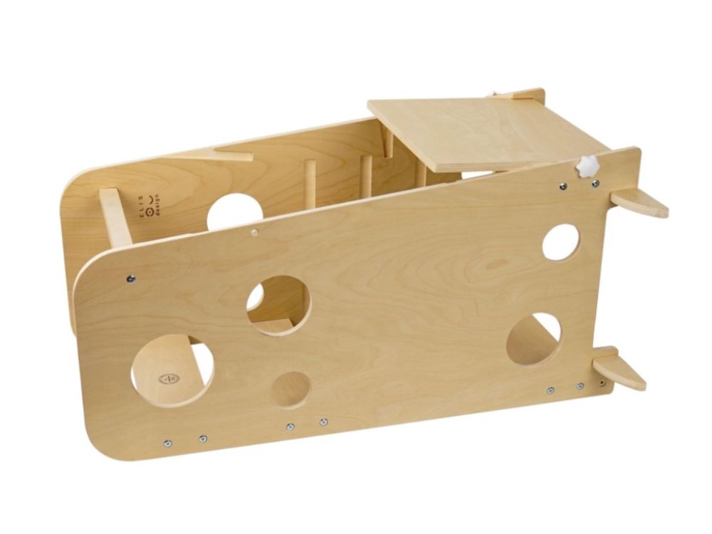 Položením učiacej veže ju jednoducho premeníte na pohodlný stolček so stoličkou. Stačí vysunúť plošinu a použiť ju na jednej alebo druhej strane učiacej veže ako dosku stolčeka. Na jednej strane rovná, na druhej strane šikmá.