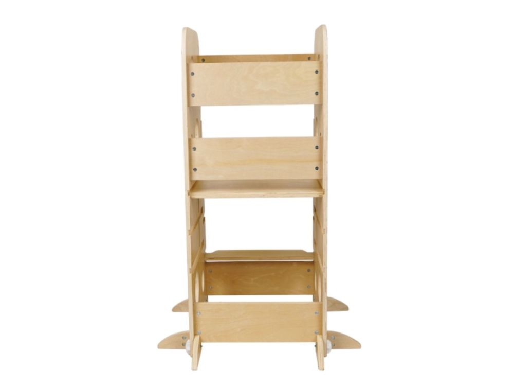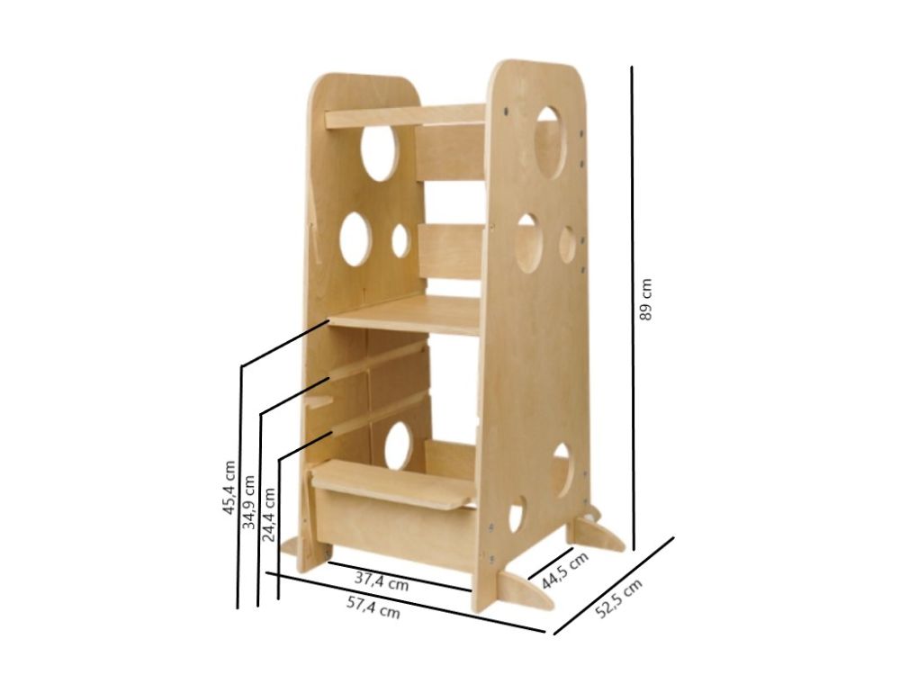 Pevnosť a stabilitu učiacej veži dodáva použitý kvalitný drevený a spojovací materiál. Predpripravené drážky umožnia jednoduchú premenu z učiacej veže na detský stôl so stoličkou, výškovo nastaviť plošinku aj multifunkčný schodík (schodík a zarážka).