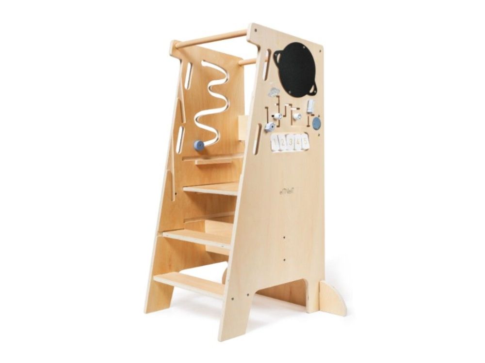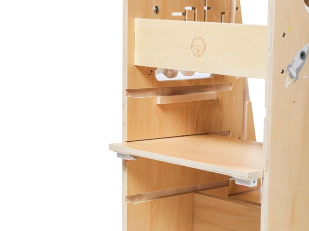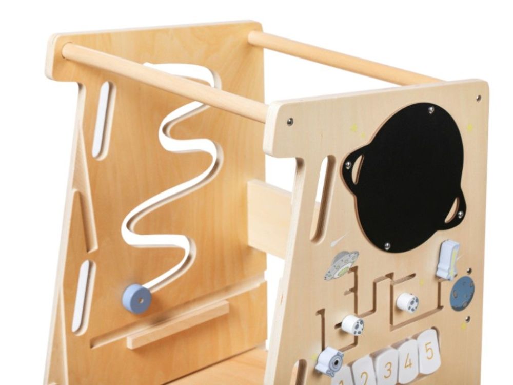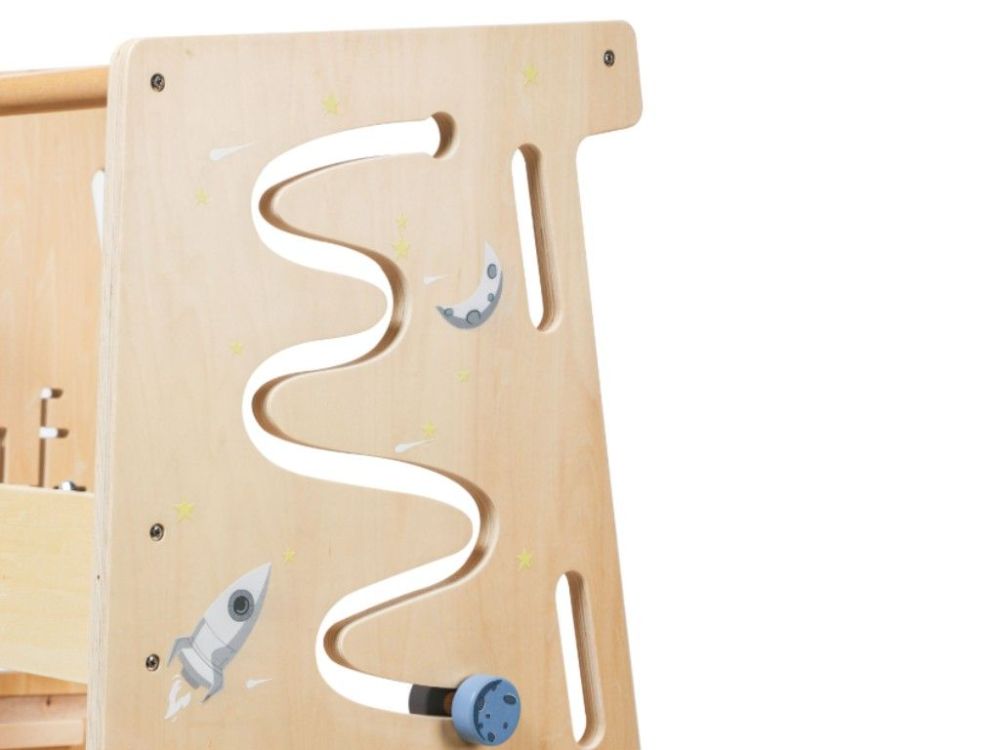Vylepšená multifunkčná učiaca veža 5v1 Play s nastaviteľnou plošinou do 3 úrovní porastie s vašim dieťaťom. Táto rastúca učiaca veža nie je len obyčajným pomocníkom do kuchyne, ale aj setom detského nábytku a úžasnou hračkou s vesmírnymi motívmi. Na jednej strane rastúcej učiacej veže nájdu deti kresliacu tabuľu, vesmírne bludisko aj otočné prvky, na druhej strane potom parádnu guľôčkovú dráhu. Pre väčšiu bezpečnosť je doplnená stabilizačnými nožičkami, podpornými doštičkami pod plošinou, zaistením stolčeka aj zábrany.