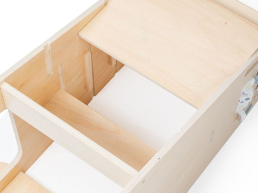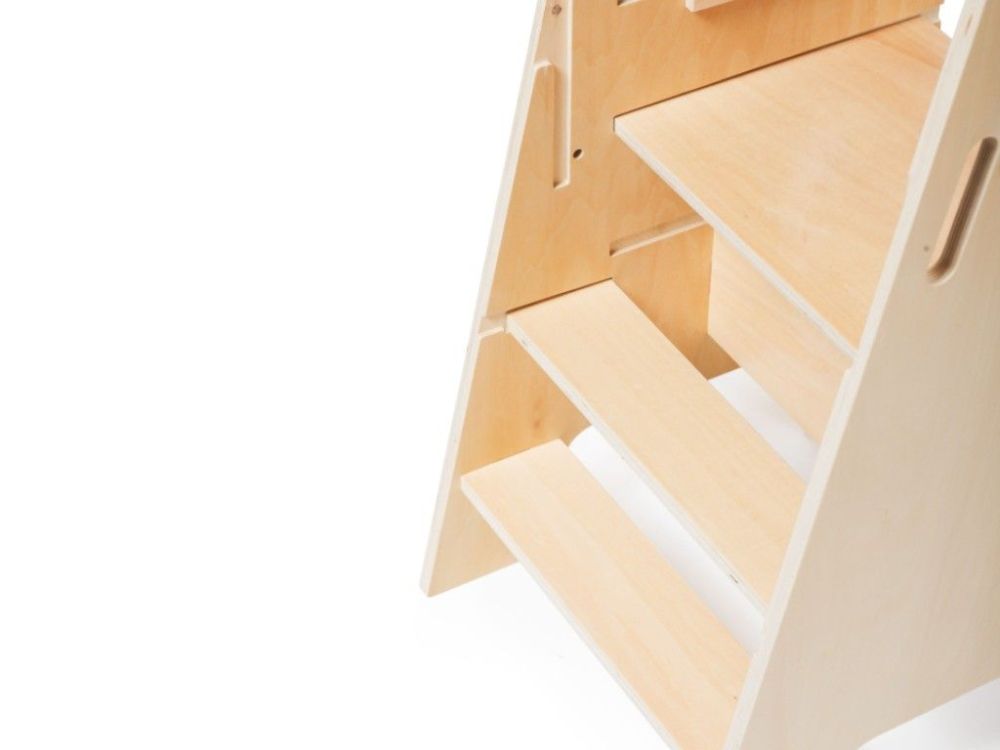 Tento všestranný pomocník sa jednoducho premení na detský stolček so stoličkou, u ktorého môžu deti tvoriť aj desiatovať. Stačí rastúcu učiacu vežu položiť zadnou stranou na podlahu a presunúť plošinu, na ktorej deti v učiacej veži stoja. Plošina poslúži ako doska stola. Obidve bočnice učiacej veže, so svojimi 4 hracími prvkami, prinášajú deťom zábavu aj možnosť vzdelávania. Na jednej strane deti nájdu parádnu guľôčkovú dráhu, na druhej strane potom kresliacu tabuľu, bludisko aj otočné doštičky s číslicami.