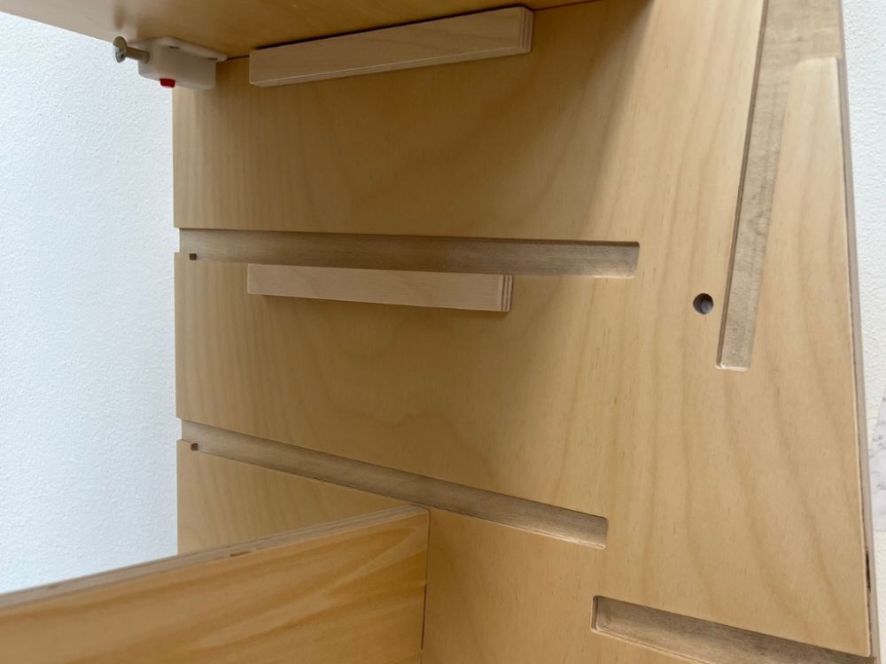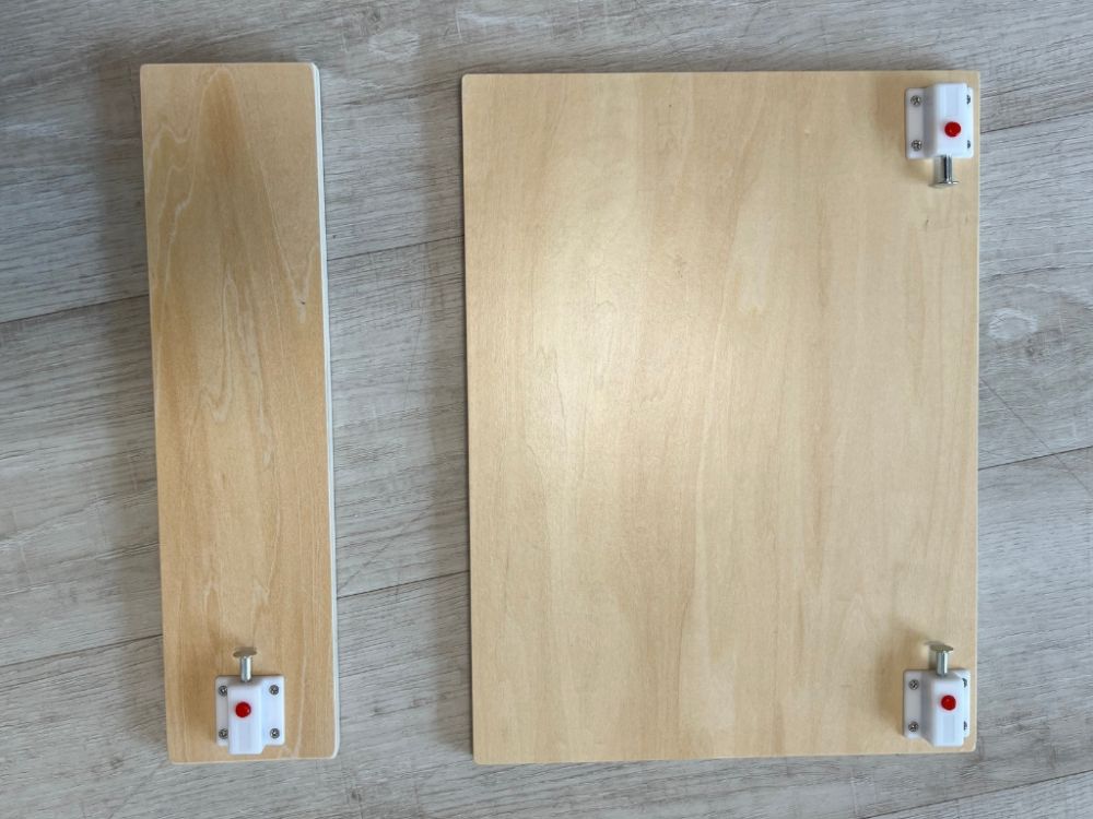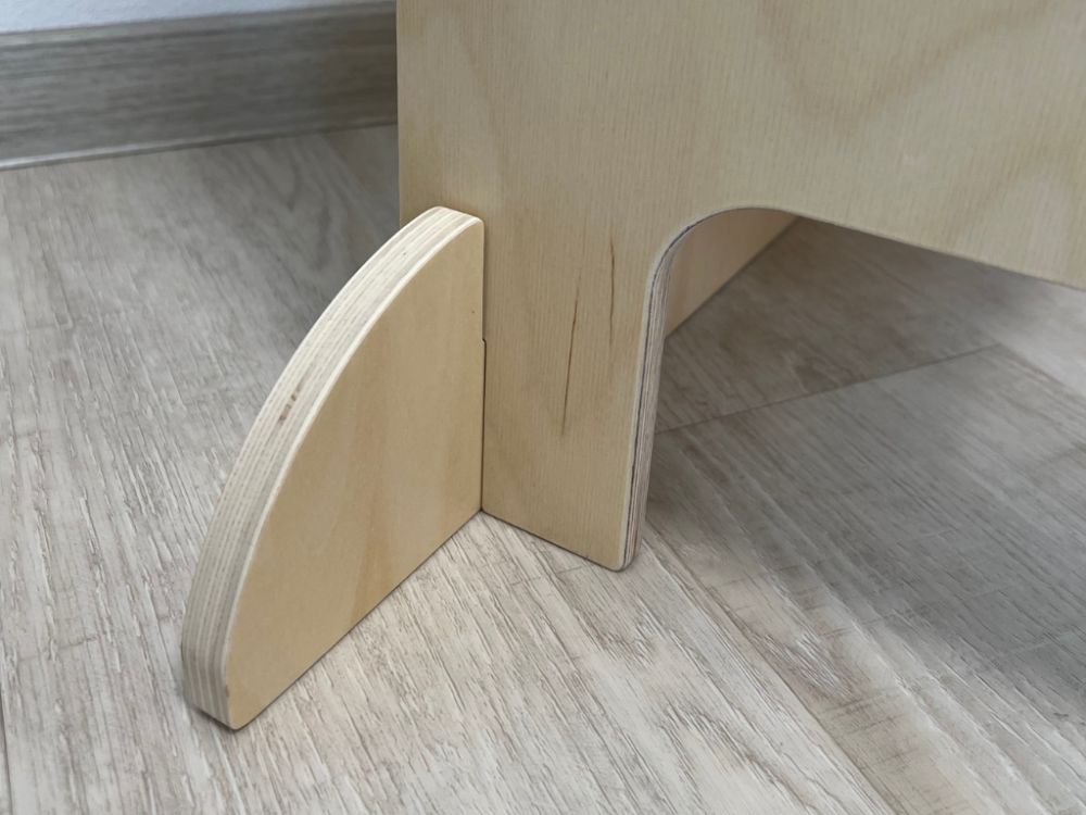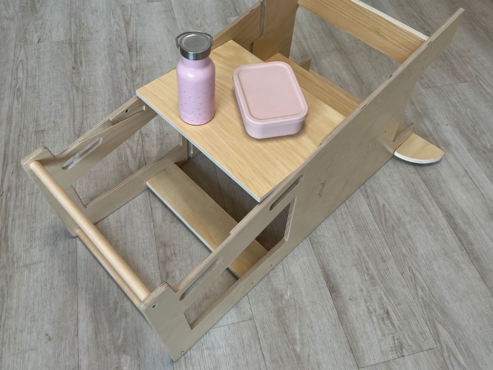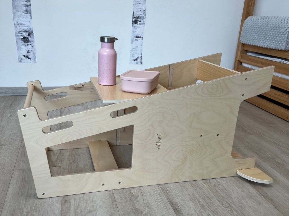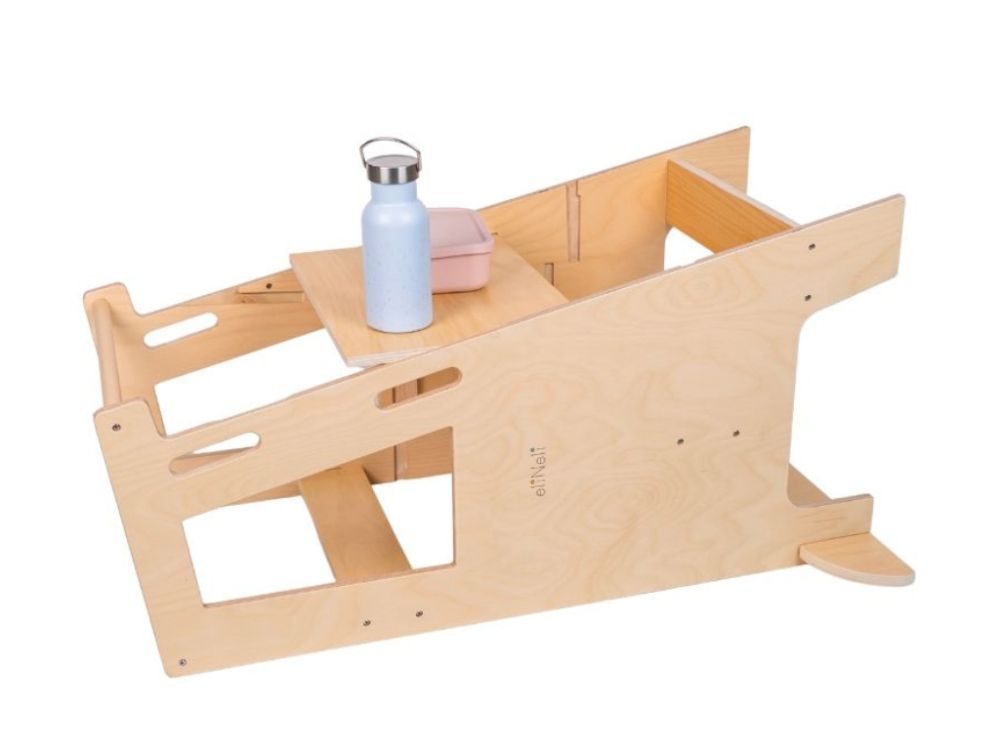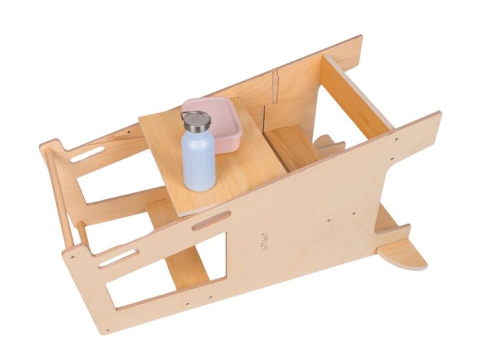 Tento všestranný pomocník sa jednoducho premení na detský stolček so stoličkou, u ktorého môžu deti tvoriť aj desiatovať. Stačí rastúcu učiacu vežu položiť zadnou stranou na podlahu a presunúť plošinu, na ktorej deti v učiacej veži stoja. Plošina poslúži ako doska stola.