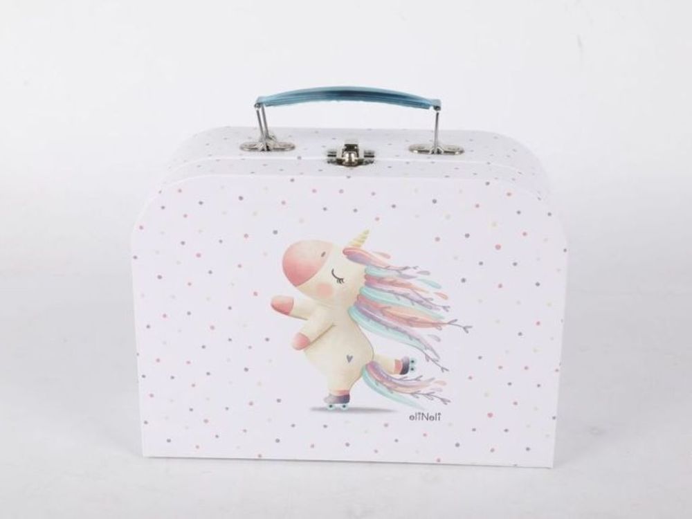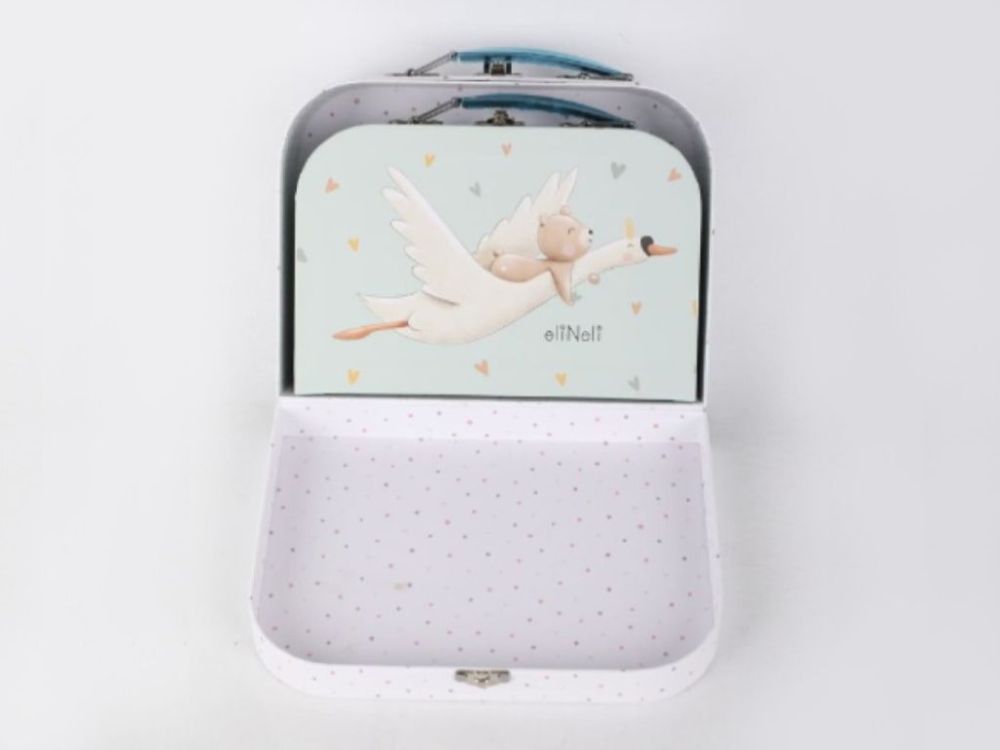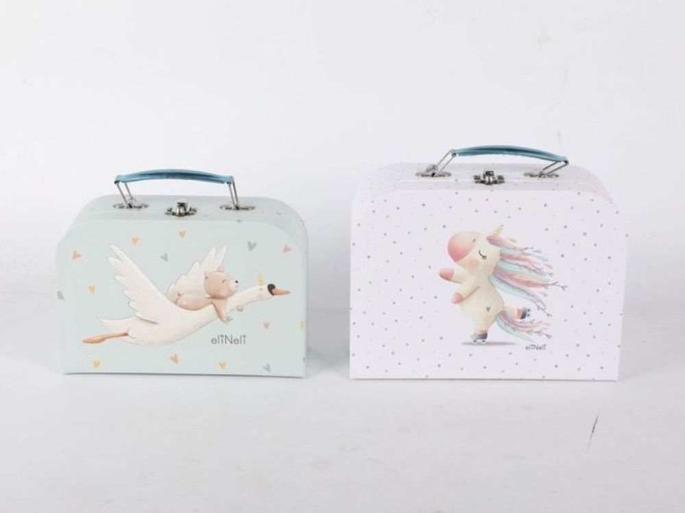 Sada kufríkov s motívom rozprávkového jednorožca a lietajúcej husi, nesúcej medvedíka, prináša jedinečný dizajn, ktorý zaujme na prvý pohľad. Sada kufríkov ponúka dve veľkosti, ktoré sa prispôsobia vašim potrebám - či už potrebujete malý kufrík na drobnosti alebo väčší.