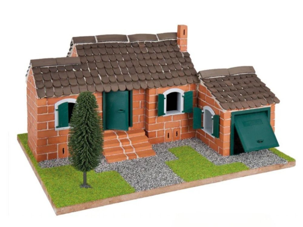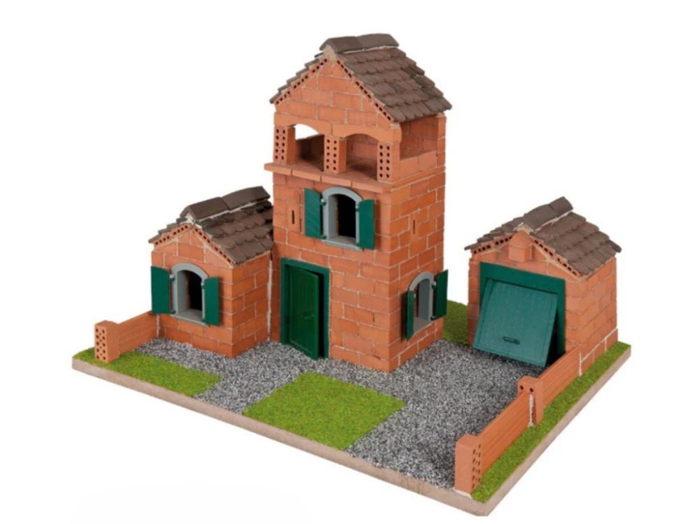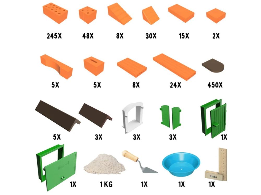 | Obsah balenia | 850 ks ( 245červených tehál, 48 červených polovičných tehál, 450 čiernych dlaždíc s bobrovým chvostom, 30 malých trojuholníkov, 8 veľkých trojuholníkov, 15 škridiel, 2 polovičné škridly, 24 strešných škridiel, 8 polovičných škridiel, 5 čiernych hrebenáčov, 3 čierne hrebenáče s hrúbkou 40 mm, 5 tehál s otvormi, 5 malých oblúkov, 1 zelený rám dverí, 1 zelené vchodové dvere, 1 zelený rám garážových dverí, 1 zelené garážové dvere, 3 oblúkové okná, 6 zelených okeníc, 1 kg špeciálnej malty, 1 základová doska, 1 hladidlo, 1 uholník a 1 miska na maltu) |