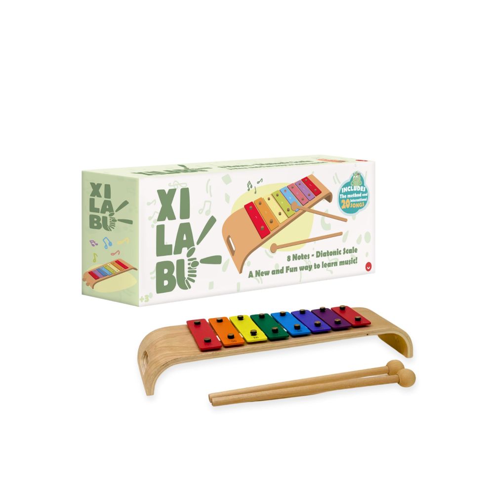 XilaBoo xylofón je ideálny prvý hudobný nástroj pre deti. Podporuje rozvoj jemnej motoriky, hudobného sluchu a kreativity. Obsahuje 8 ladených tónov v dúhových farbách, ktoré uľahčujú prehrávanie piesní. Súčasťou balenia je anglický spevník s 20 piesňami.